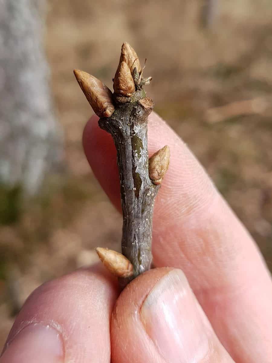 - Knospen: Groß, spitz kegelförmig, schwach fünfkantig und vielschuppig. Sie sitzen gehäuft an den Triebenden. Die Knospenschuppen sind hell orangebraun mit dunkler Spitze.