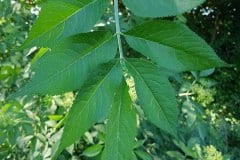 Blätter: Die gegenständigen Laubblätter sind unpaarig gefiedert. Die einzelnen Blattfiedern sind etwa 30 Zentimeter lang und bestehen aus meist fünf oder sieben Einzelblättern, die elliptisch und am Rand gesägt sind. Die Einzelblätter sind jeweils bis etwa 12 Zentimeter lang. Das Blattwerk entwickelt sich etwa im März bis April. Zerreibt man ein Blatt zwischen den Fingern, riecht es auch leicht nach den Blüten; so kann Holunder auch einfach erkannt werden, wenn er keine Blüten oder Früchte trägt.