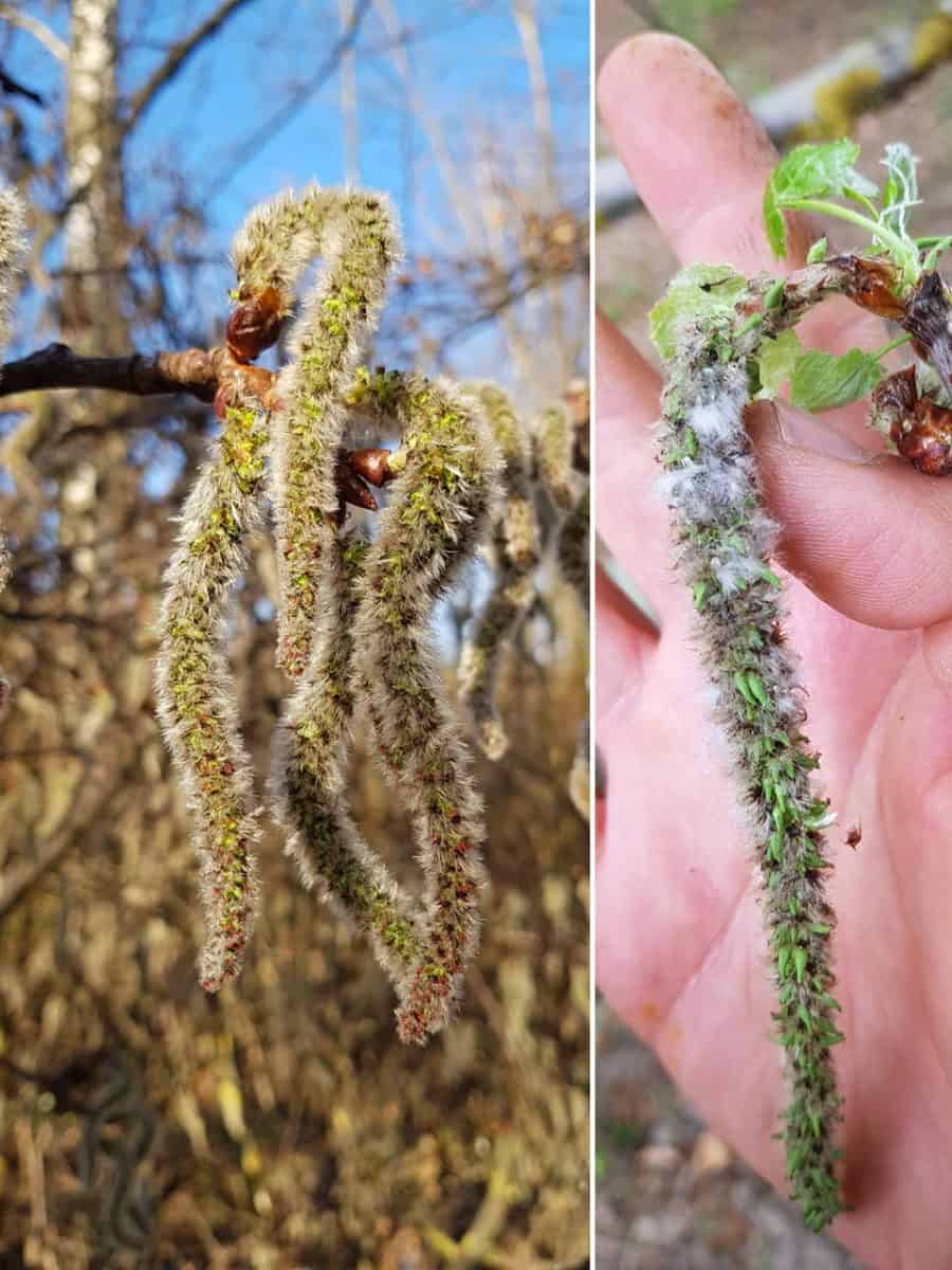 - Blütenstand: Zweihäusig getrenntgeschlechtig; hängende, grauzottige Kätzchen