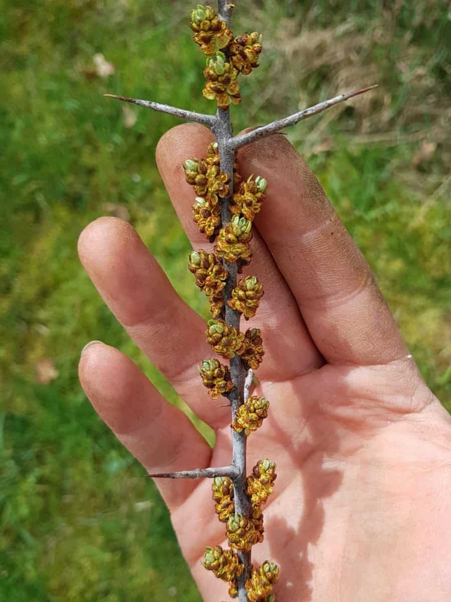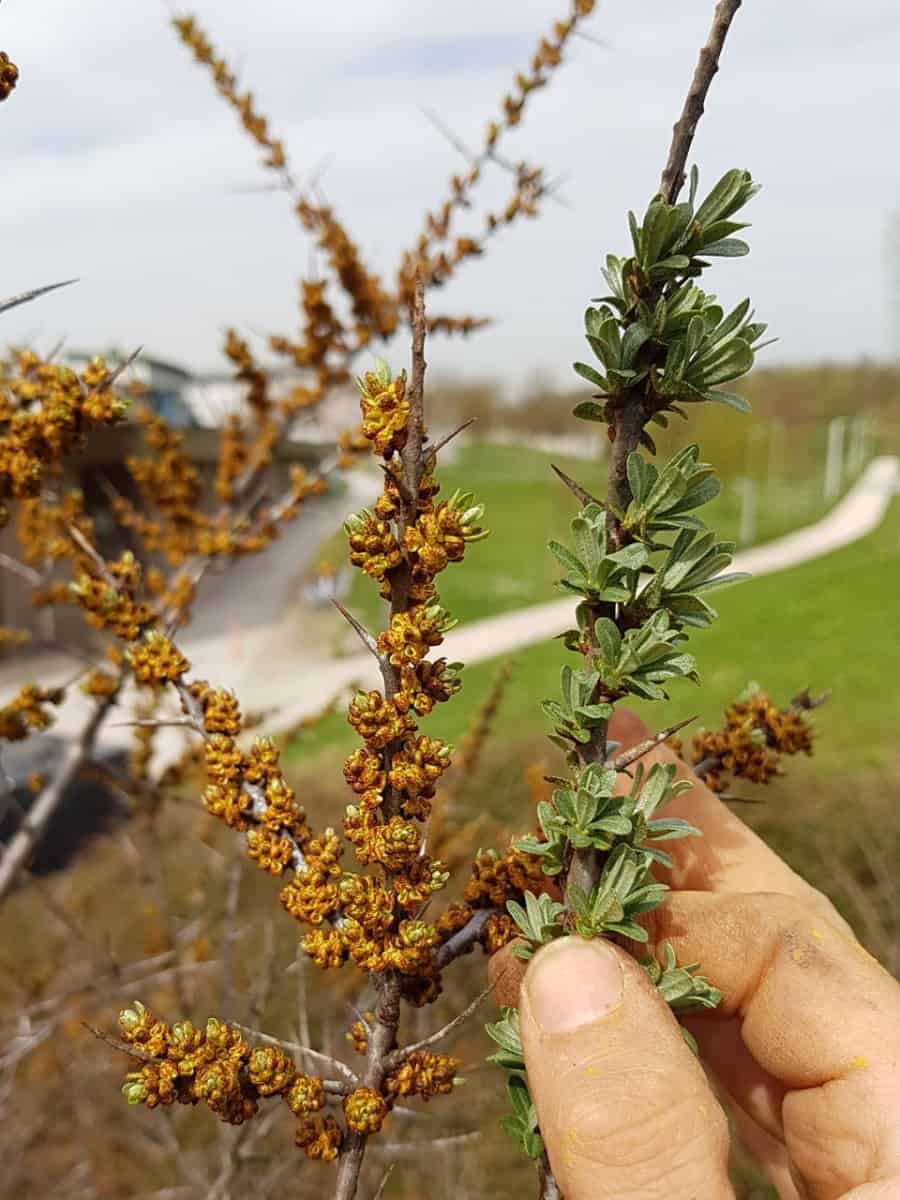 - Blüte: Sanddorn ist zweihäusig (getrennte männliche und weibliche Pflanzen). Die Blüten sind klein, gelblich-grün und erscheinen vor den Blättern an der Basis vorjähriger Triebe. Die männlichen Blüten bilden Pollen für die Windbestäubung, die weiblichen stehen in kurzen Ähren.