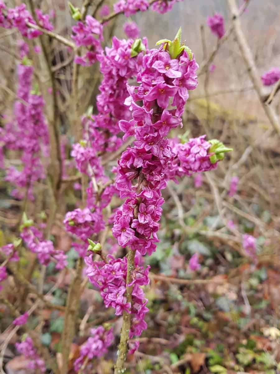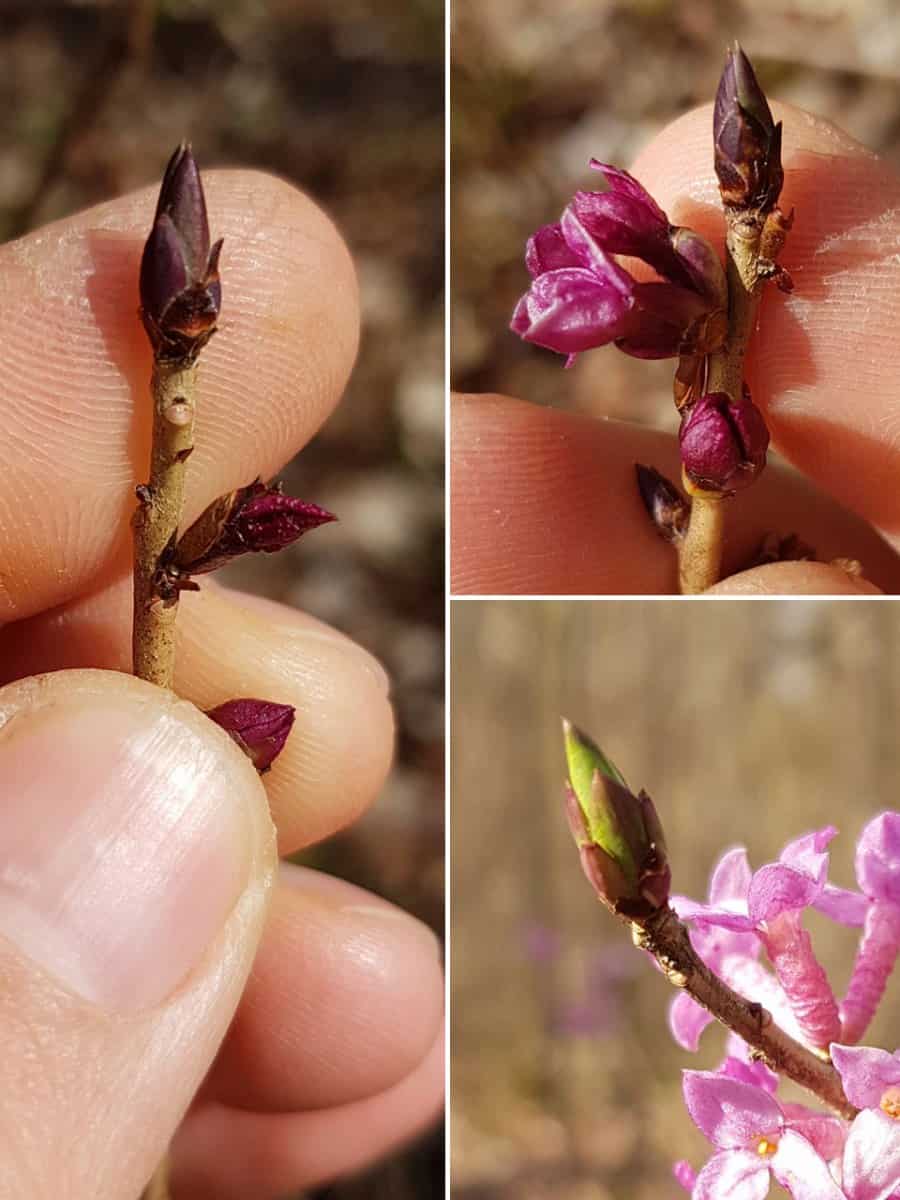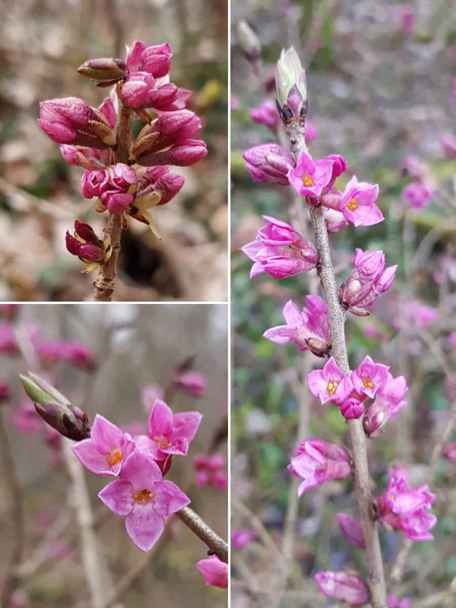 - Blüte: Die 7 bis 9 mm großen Blüten sind rosa bis purpurrot und verströmen einen intensiven, starken Duft. Sie erscheinen vor dem Laubaustrieb und sitzen meist in Dreiergruppen seitenständig direkt an der Sprossachse.