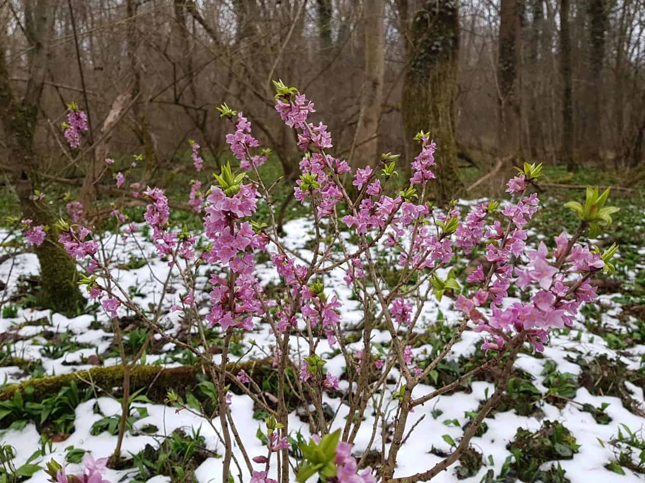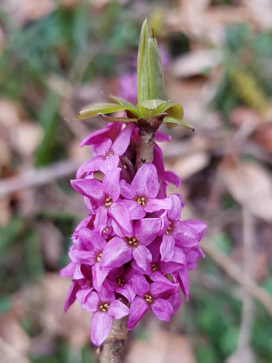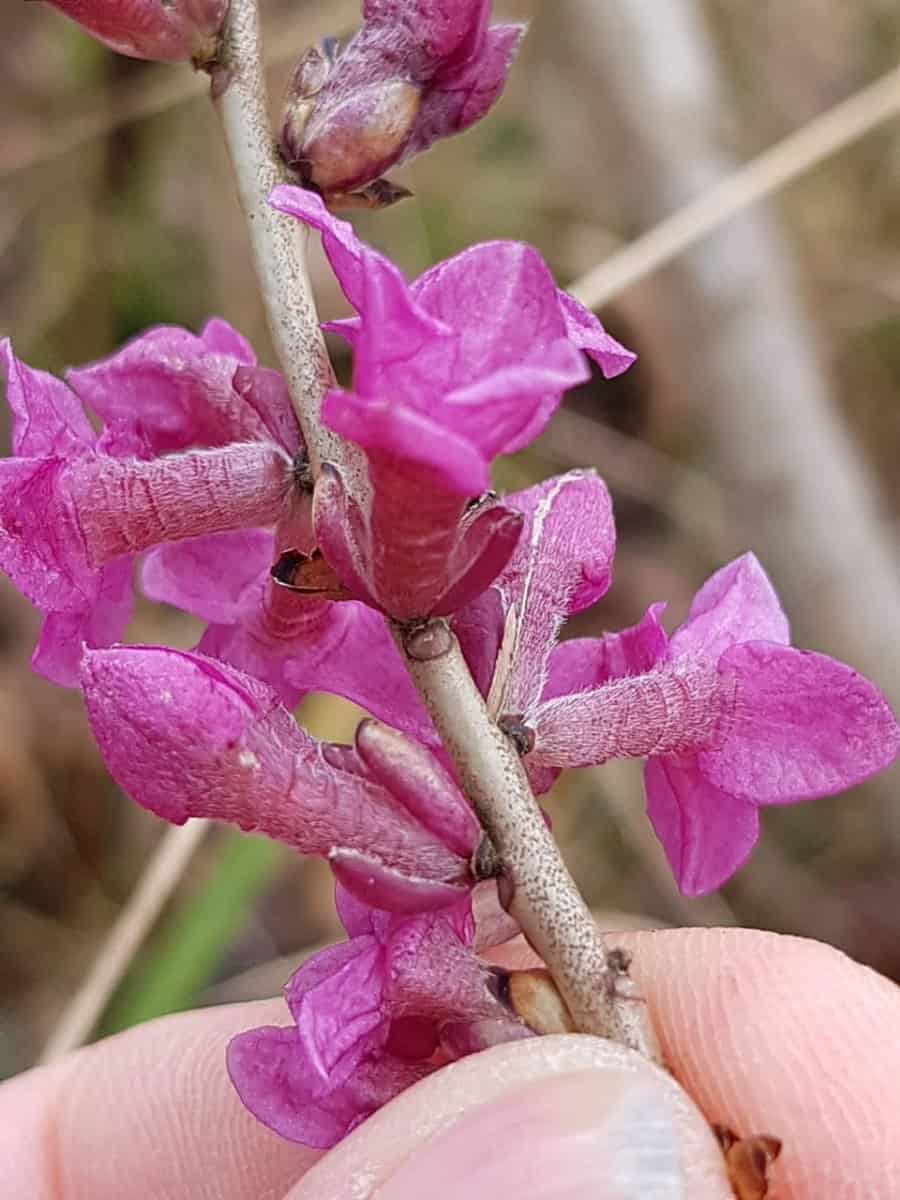 - Blüte: Die 7 bis 9 mm großen Blüten sind rosa bis purpurrot und verströmen einen intensiven, starken Duft. Sie erscheinen vor dem Laubaustrieb und sitzen meist in Dreiergruppen seitenständig direkt an der Sprossachse.