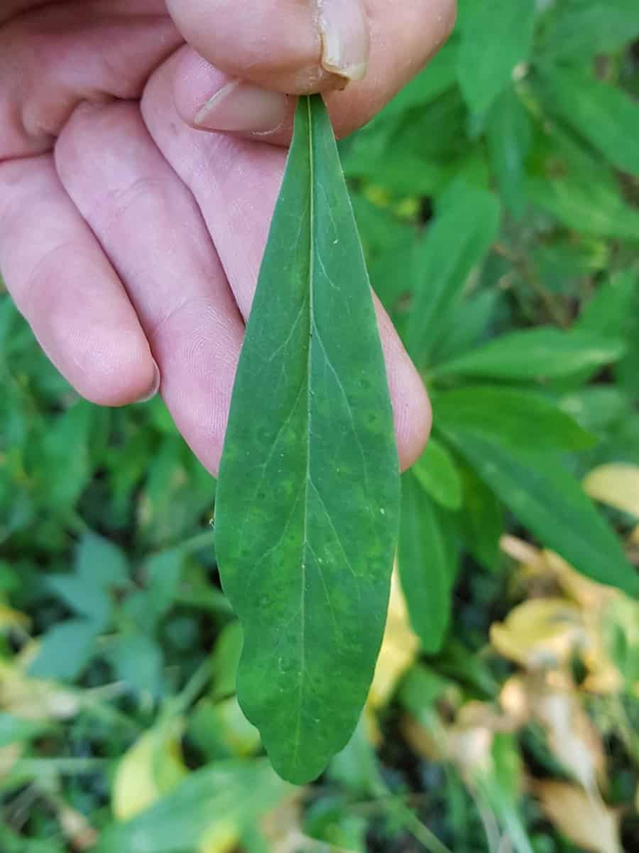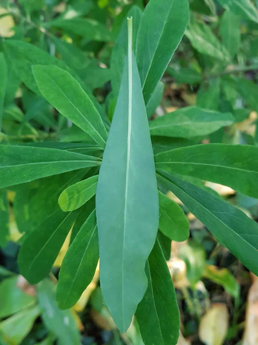 - Blätter: Entwickeln sich erst nach der Blüte spiralig an den Zweigspitzen. Sie sind kurz gestielt, 4 bis 9 cm lang, verkehrt-lanzettlich und ganzrandig. Die Oberseite ist frischgrün, die Unterseite graugrün. Nach dem Austrieb sind sie weich und leicht behaart.