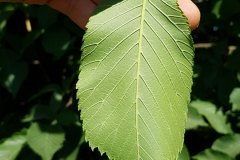 Blätter: Die Laubblätter der Bergulme sind, wie bei allen mitteleuropäischen Ulmenarten, asymmetrisch, veränderlich, 8 bis 20 cm lang, größere Blätter sind oft dreispitzig, sie sind in der Mitte am breitesten, häufig mit 13 bis 20 Nervenpaaren, oberseits eher rau, unterseits kurzhaarig.