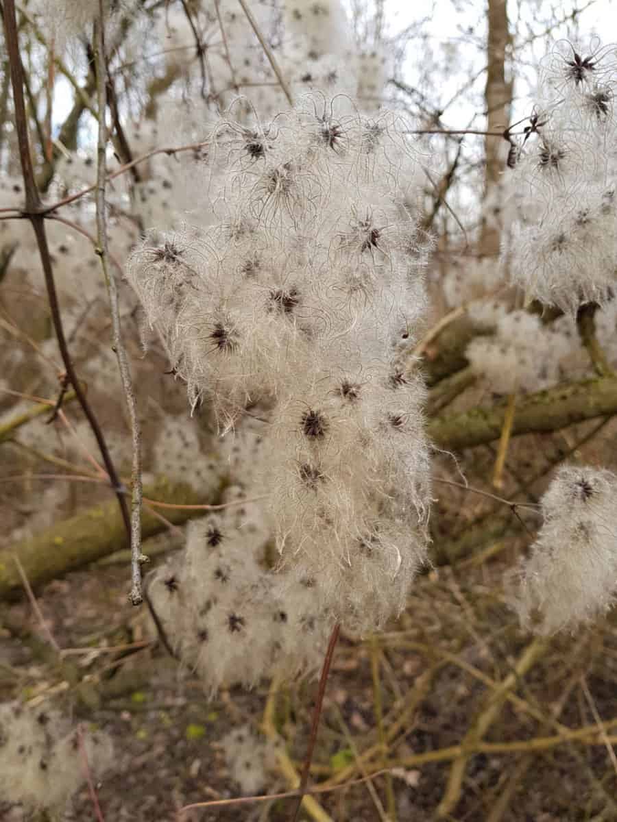 Die Waldrebe wächst als verholzende Kletterpflanze. Du erkennst sie leicht an ihren lianenartigen Stängeln, die sich oft wie dicke Seile um Wirtsbäume schlingen, sowie im Winter an den charakteristischen „Wuschelköpfen“ der reifen Samenstände.