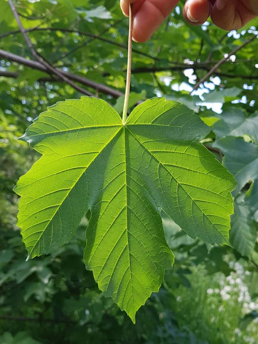 🌳 Berg-Ahorn: Die Blattspreite ist fünflappig (manchmal auch dreilappig). Im Vergleich zum Spitz-Ahorn sind die Blattlappen kürzer zugespitzt und nicht in lange, fadenförmige Zipfel ausgezogen. Ein wesentliches Merkmal: Die Blattbuchten (Einschnitte) treffen im spitzen Winkel aufeinander (V-förmig, wie mit einer Schere eingeschnitten). Die Laubblätter färben sich im Herbst intensiv goldgelb. Der Blattstiel enthält keinen Milchsaft (klarer Saft).