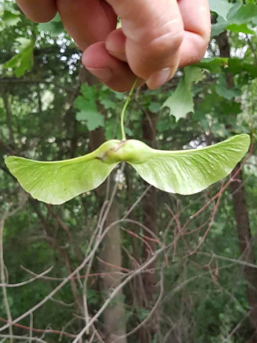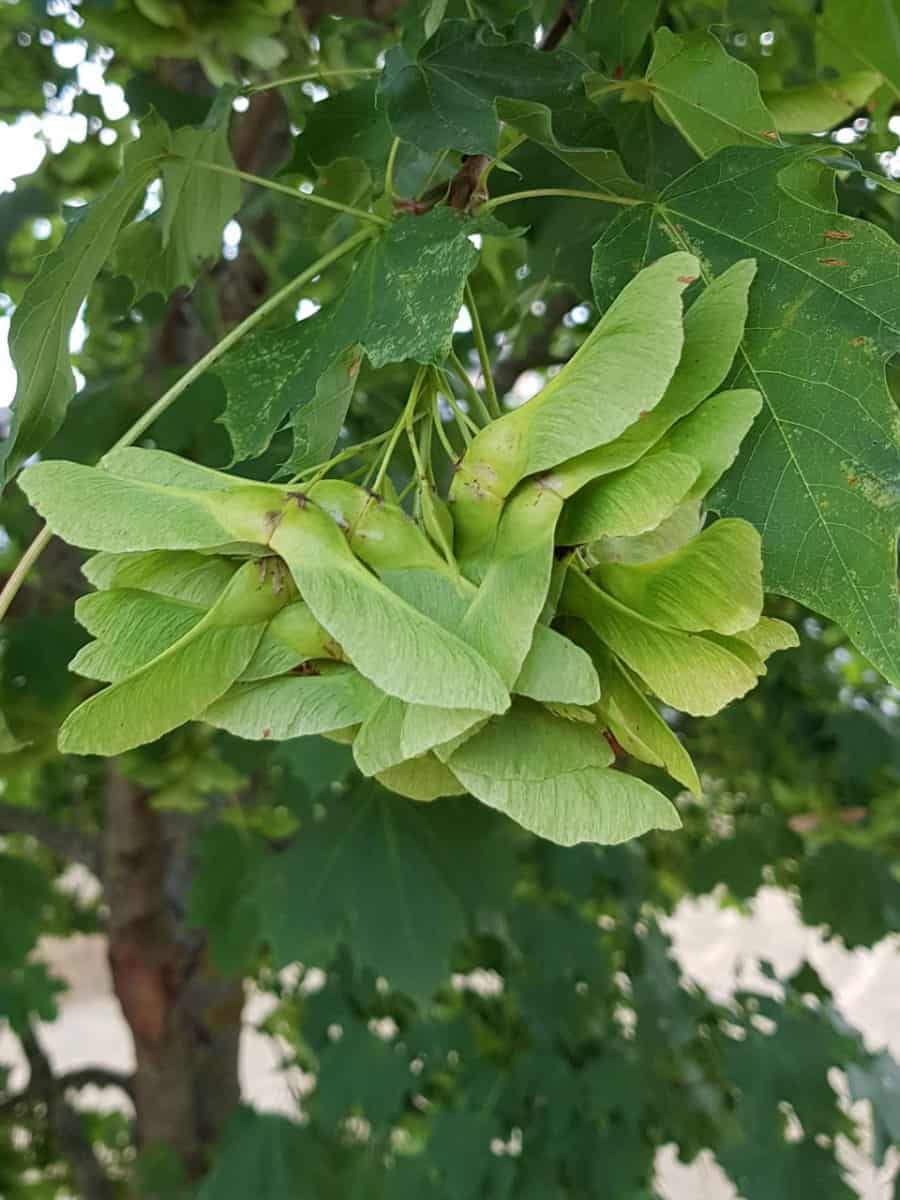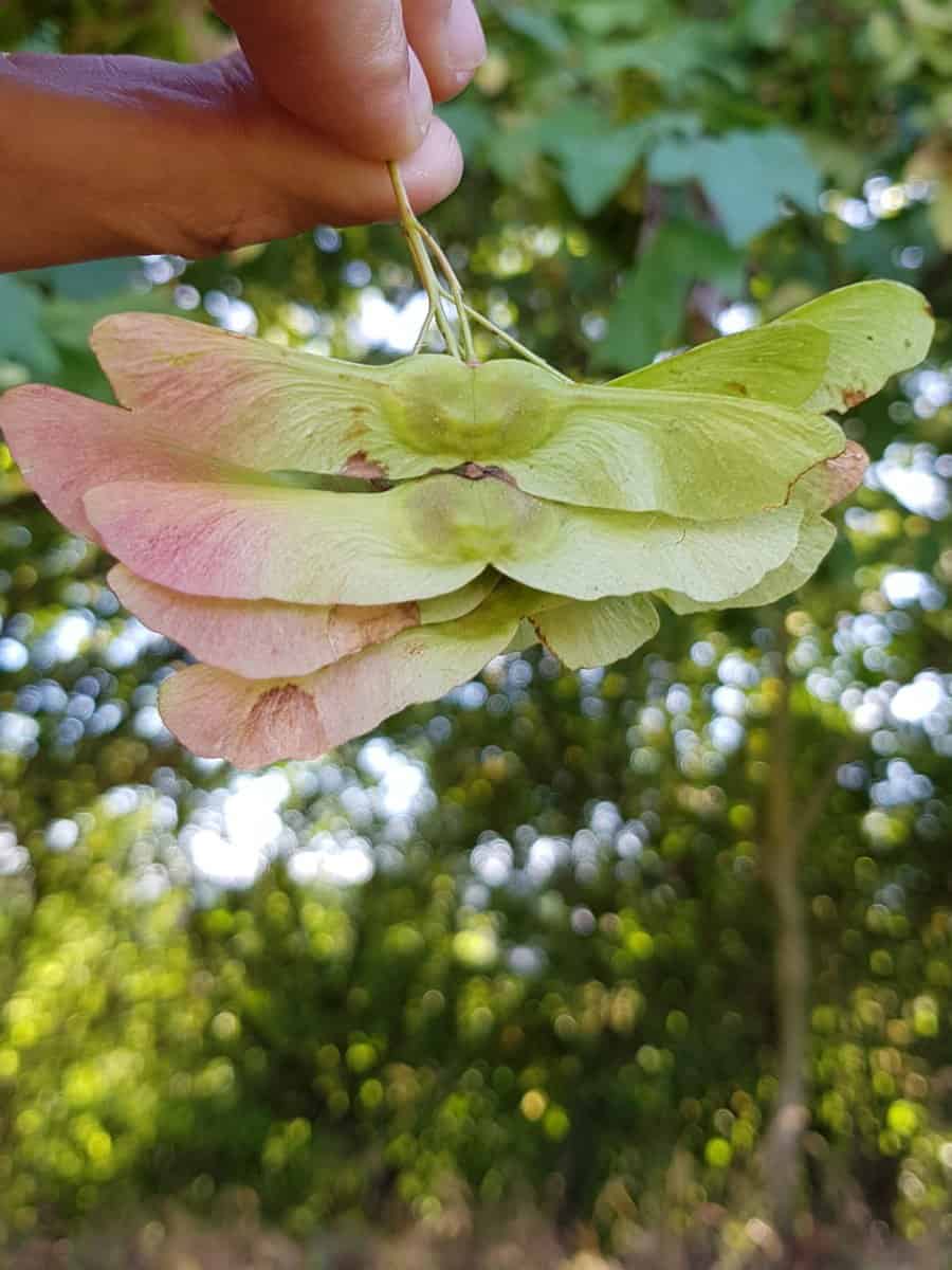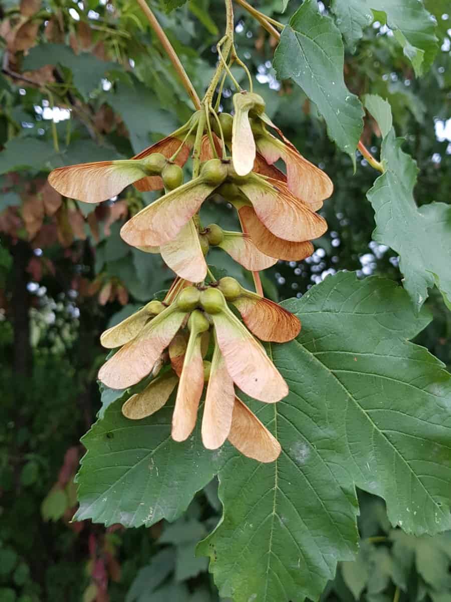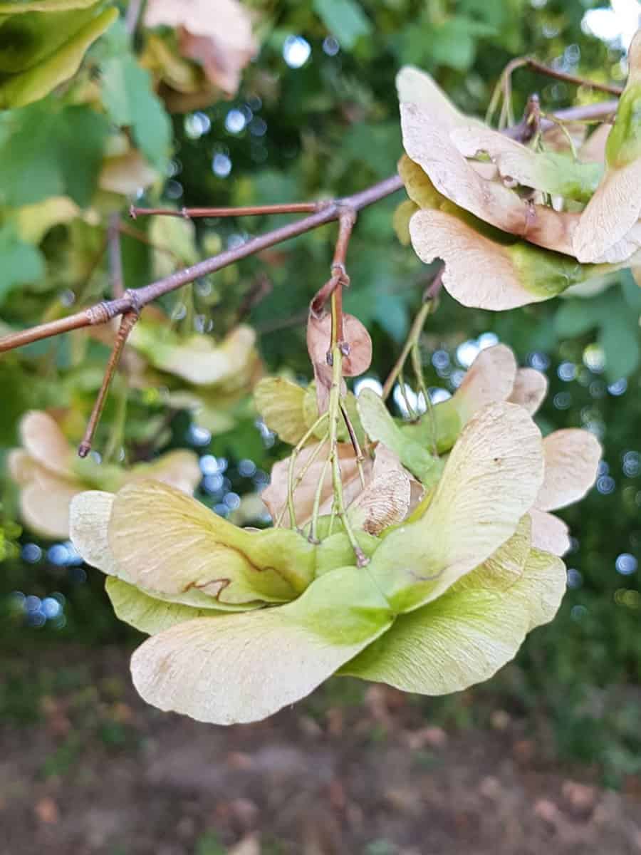 🌳 Feld-Ahorn: Die Spaltfrüchte bestehen aus zwei flachen, oft graufilzigen Nüsschen. Die beiden Flügel stehen fast waagerecht (in einer Linie) voneinander ab. Die Früchte reifen von September bis Oktober.