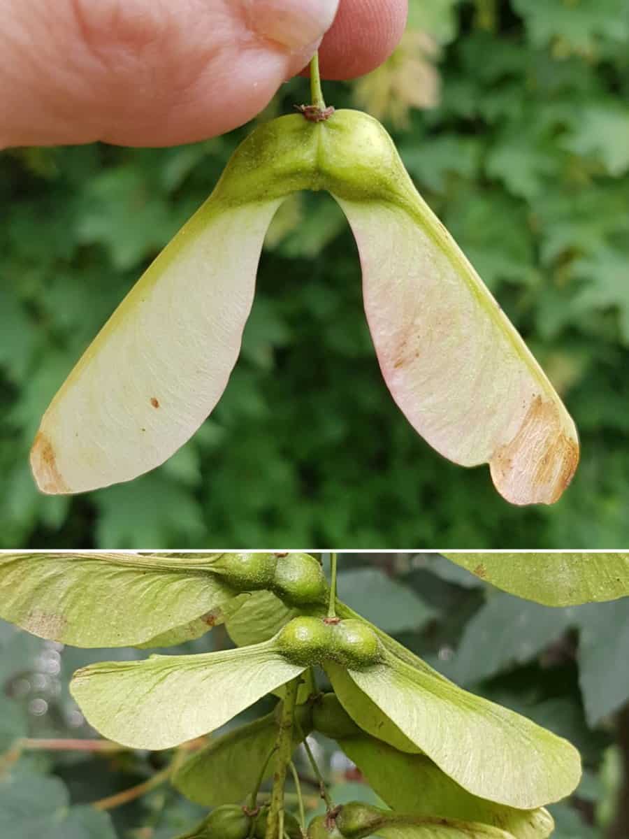 🌳 Berg-Ahorn: Die kugeligen Flügelnüsse sind paarweise angeordnet. Ein entscheidendes Merkmal: Die beiden Flügel der Spaltfrucht sind deutlich spitzwinklig zueinander angeordnet (sie bilden oft die Form eines „V“ oder einer spitzen Zange). Die Früchte reifen von Ende August bis Anfang Oktober.