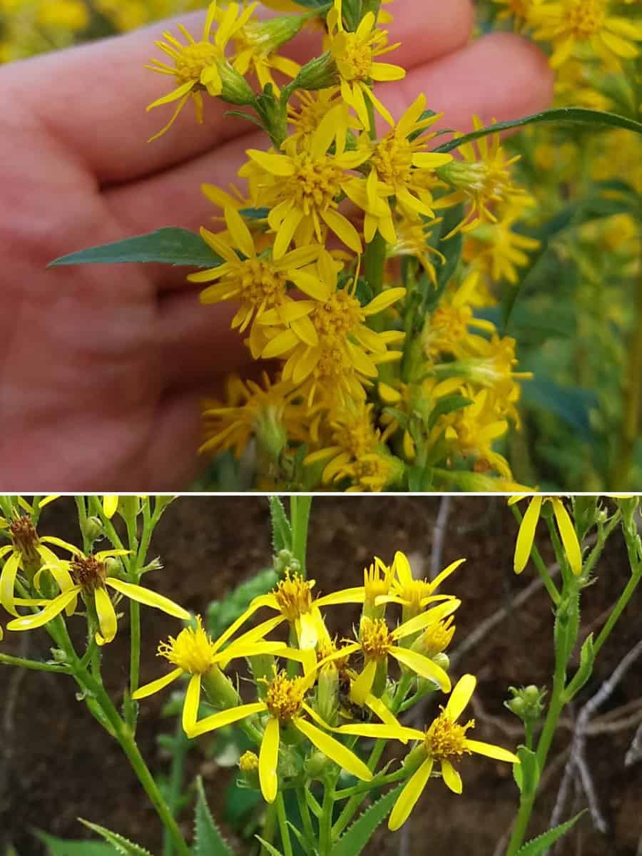 Hinweis: Die (heimische) Gewöhnliche Goldrute unterscheidet sich durch ihre weniger stark verzweigten, eher traubigen Blütenstände und den längeren Zungenblüten (bzw. insgesamt größeren Blütenköpfchen) unverwechselbar von den folgend gegenübergestellten Neophyten. Sie wird eher mit dem Fuchsgreiskraut verwechselt (Bilder siehe unten). Im Lexikon selbst findet sich nur die Kanadische Goldrute im Detail beschrieben (die Riesen-Goldrute ist genauso wie diese zu verwenden).