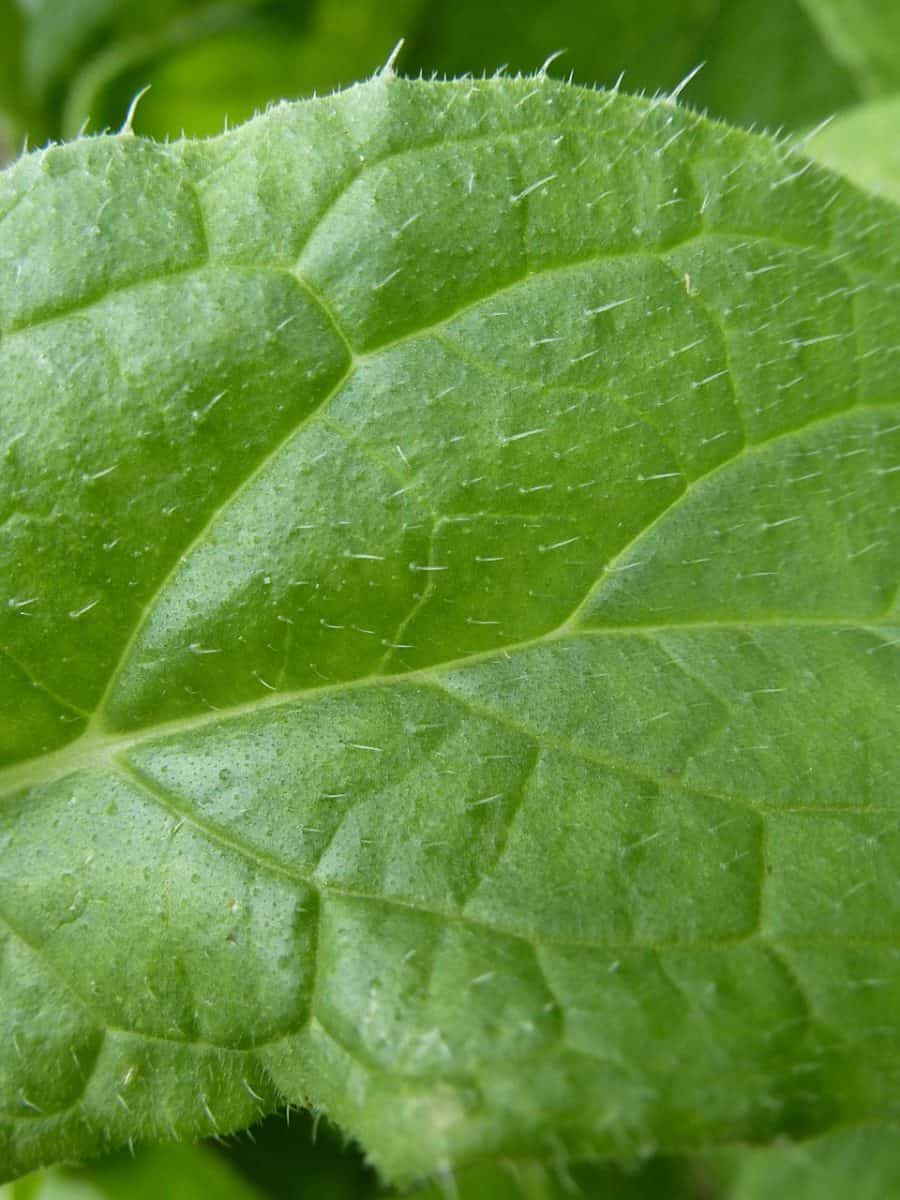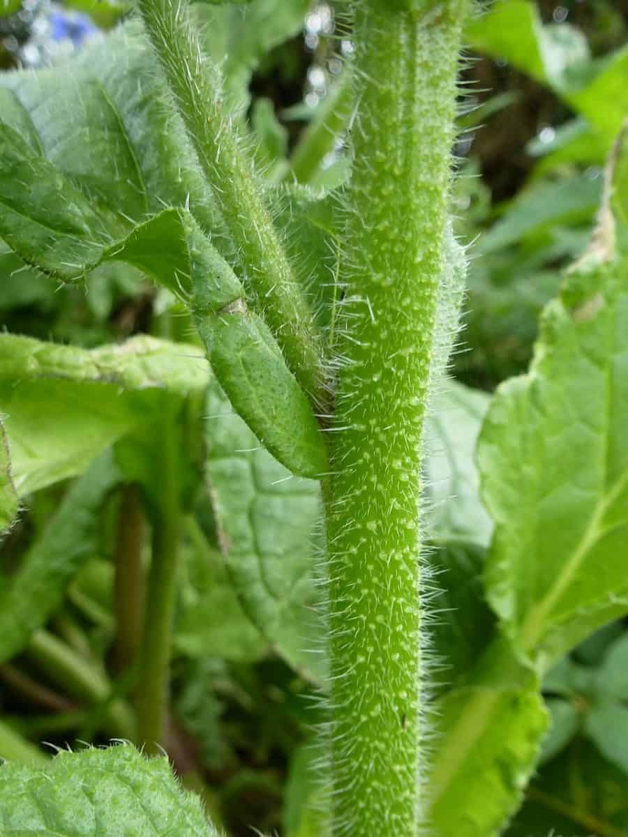 Die gesamte Pflanze wirkt „ungekämmt“. Stängel und Blätter sind dicht mit steifen, abstehenden Borstenhaaren besetzt, die sich bei Berührung rau und stachelig anfühlen. Der Stängel ist dick, saftig und innen hohl.