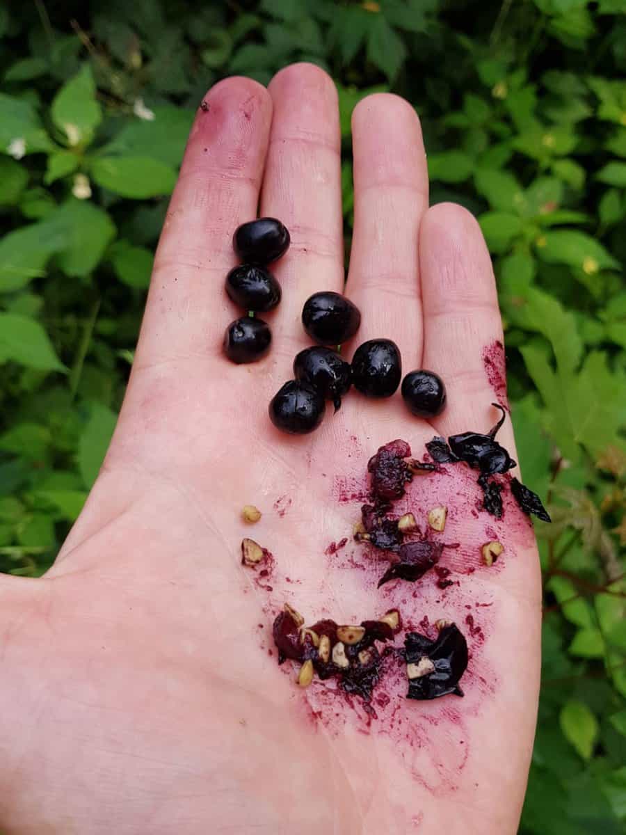 - Früchte: Aus den Blüten entwickeln sich im Spätsommer glänzend schwarze, leicht eiförmige Beeren. Sie sitzen an langen Stielen und sehen fast aus wie schwarze Johannisbeeren oder kleine Tollkirschen.