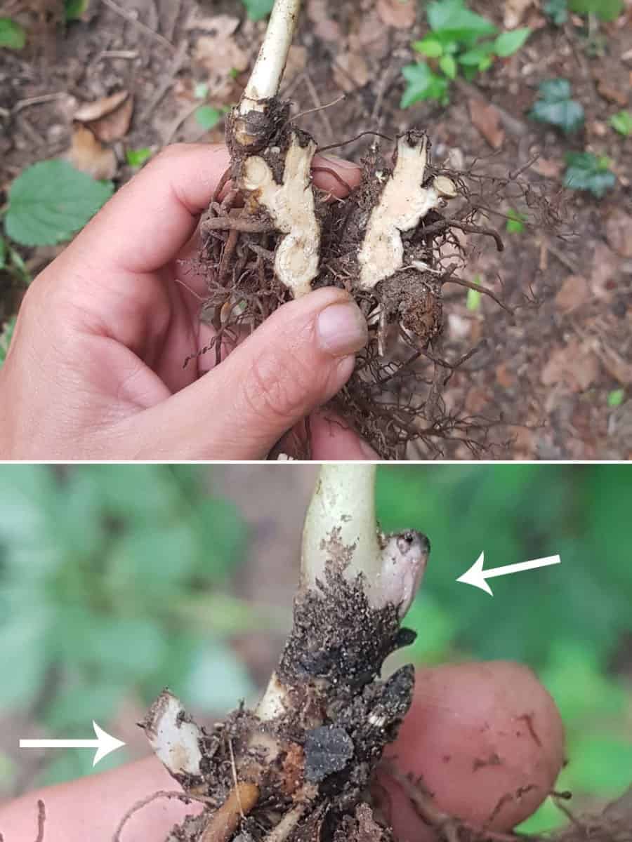 - Wurzelwerk: Kräftiges, knotiges, schwarzbraunes Rhizom