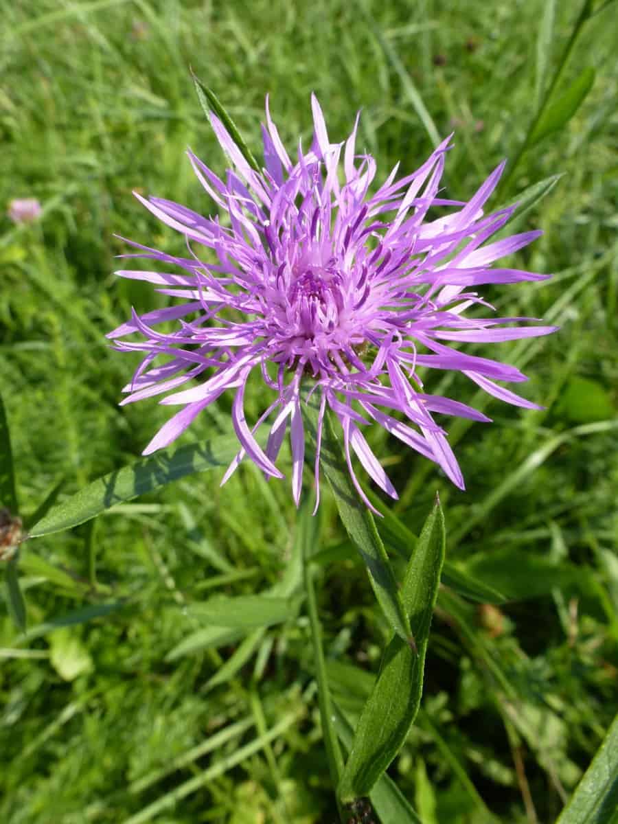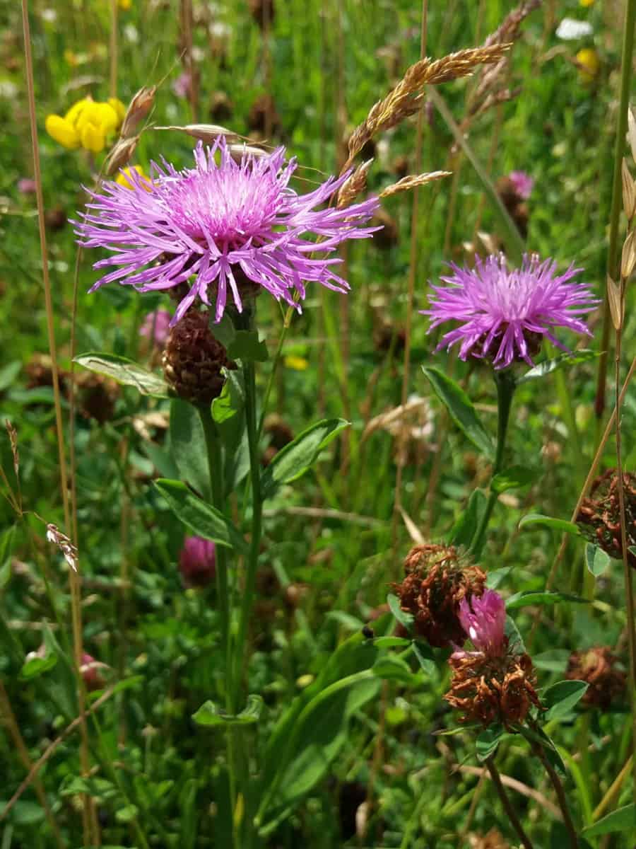 Die Wiesen-Flockenblume erkennst du gut an den auffällig vergrößerten Randblüten und den charakteristischen, löffelartigen Hüllblattanhängseln direkt unter der Blüte.