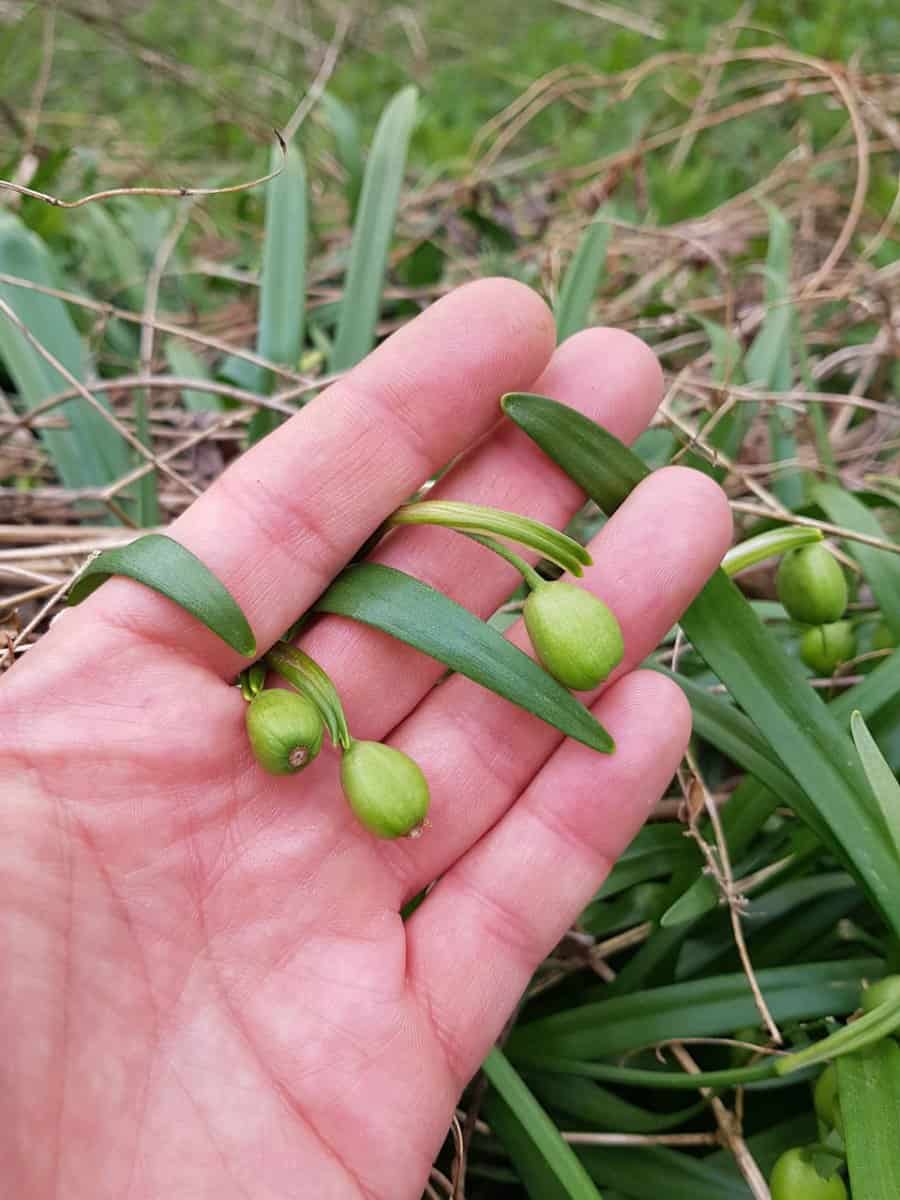 - Früchte: Es bildet sich eine fleischige, birnenförmige Kapsel, die sich langsam zum Boden absenkt.