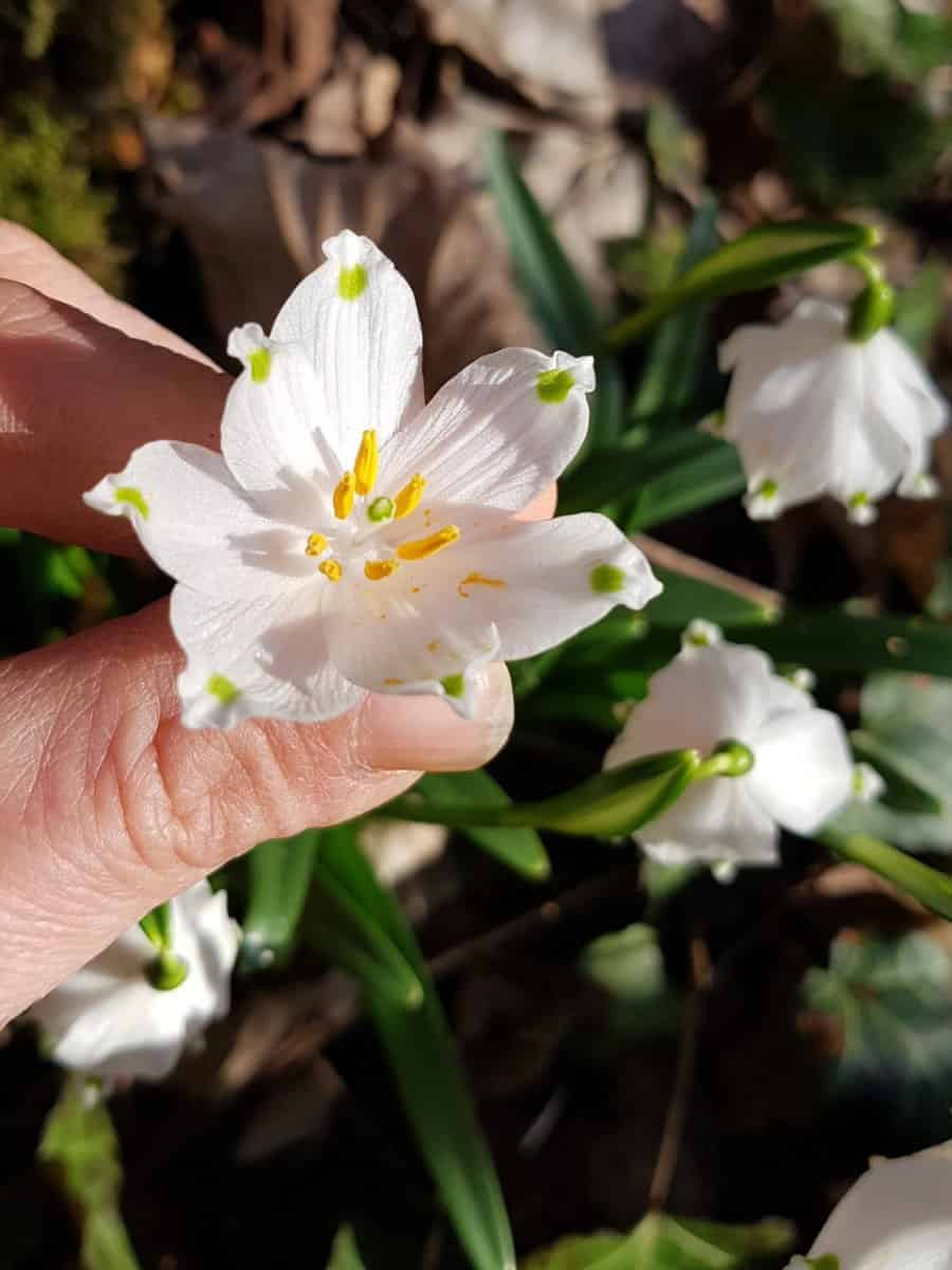 Die Frühlings-Knotenblume ist an ihren großen, reinweißen Glocken mit den charakteristischen gelbgrünen Punkten leicht im Vorfrühling zu erkennen.