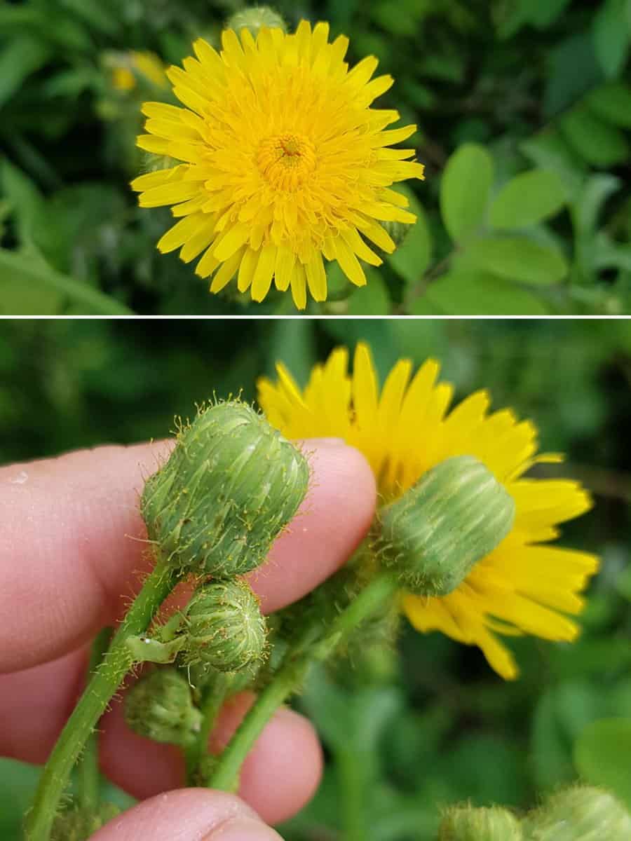 - Gemüse-Gänsedistel (Sonchus oleraceus): Einjährig, matte (nicht glänzende) Blätter, und völlig ohne Drüsenhaare an den Blütenstielen und Hüllblättern. Ebenfalls essbar.