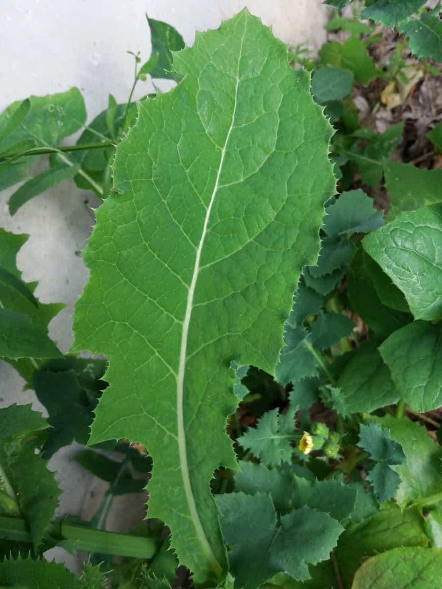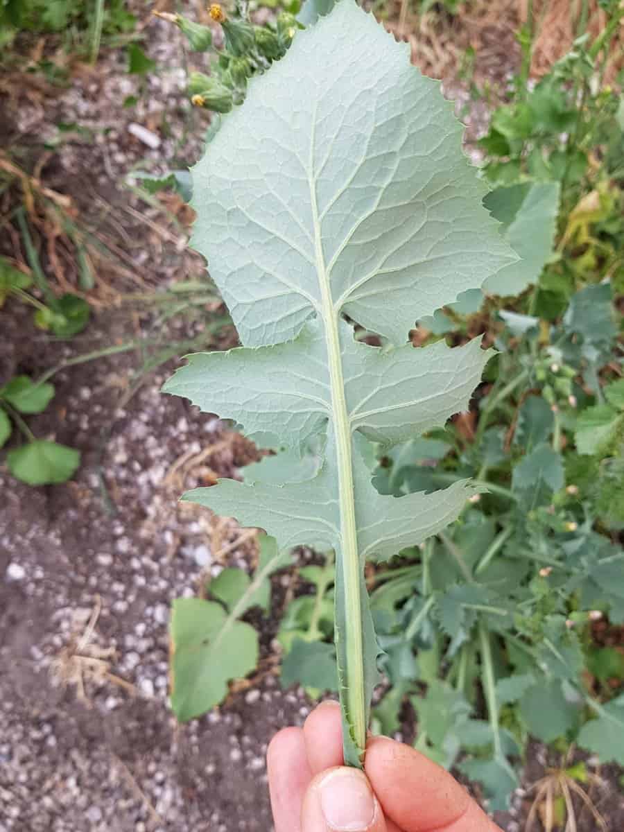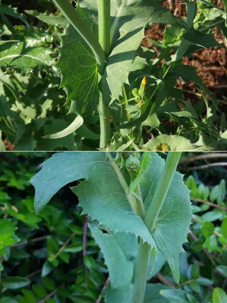 - Raue Gänsedistel (Sonchus asper): Die Blätter sind derb, glänzend dunkelgrün, meist ungeteilt und am Rand fühlbar stechend gezähnt. Eindeutiges Unterscheidungsmerkmal am Blattansatz: Die stängelumfassenden Zipfel (Öhrchen) sind bei der Rauen Gänsedistel rund, nicht spitz. Ebenfalls essbar.