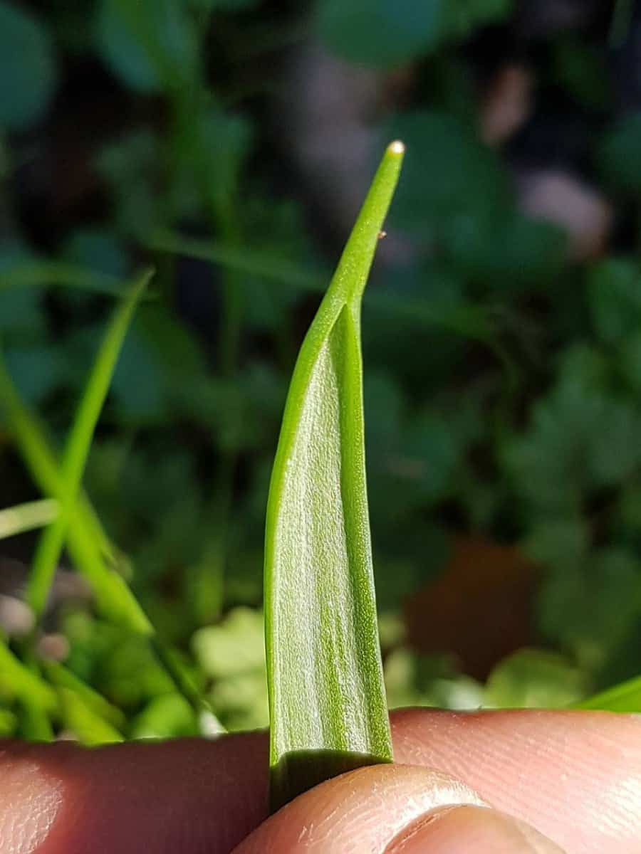 • Grundblatt: Pro Zwiebel wird in der Regel nur ein einziges, linealisches Grundblatt gebildet. Es ist 7 bis 15 mm breit, zeigt schwache Kiele und läuft an der Spitze charakteristisch kapuzenartig zusammen.