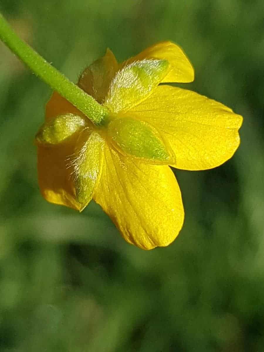 - Kelchblätter: Die meist fünf gelblichen Kelchblätter sind rau behaart und liegen den Kronblättern an (sie sind ausgebreitet, aber nicht nach unten zurückgeschlagen).