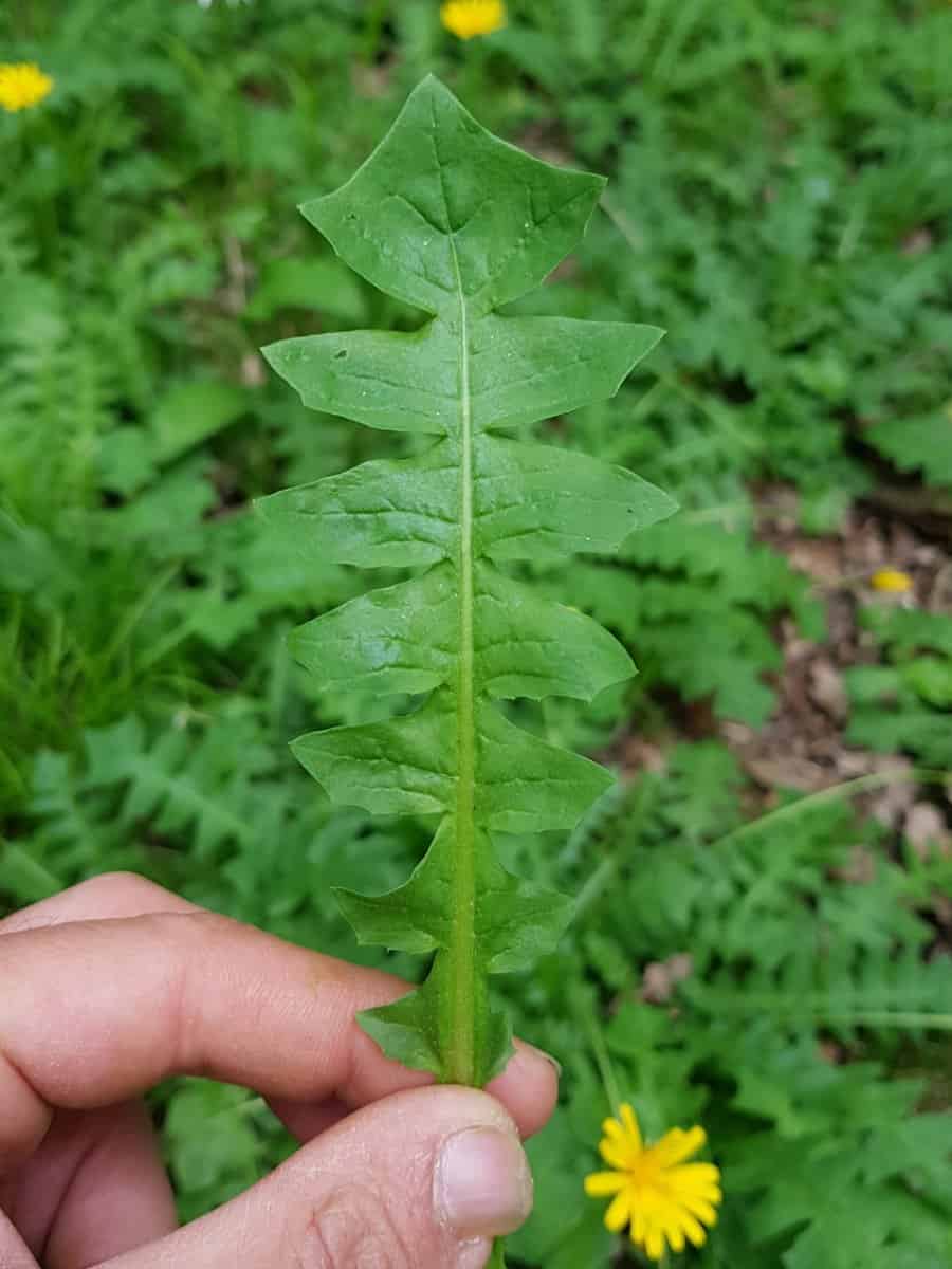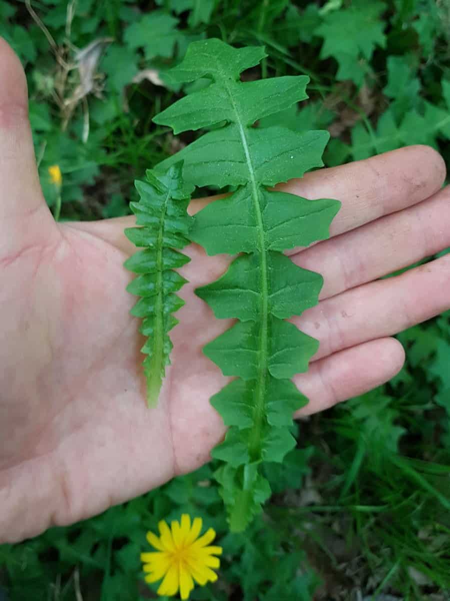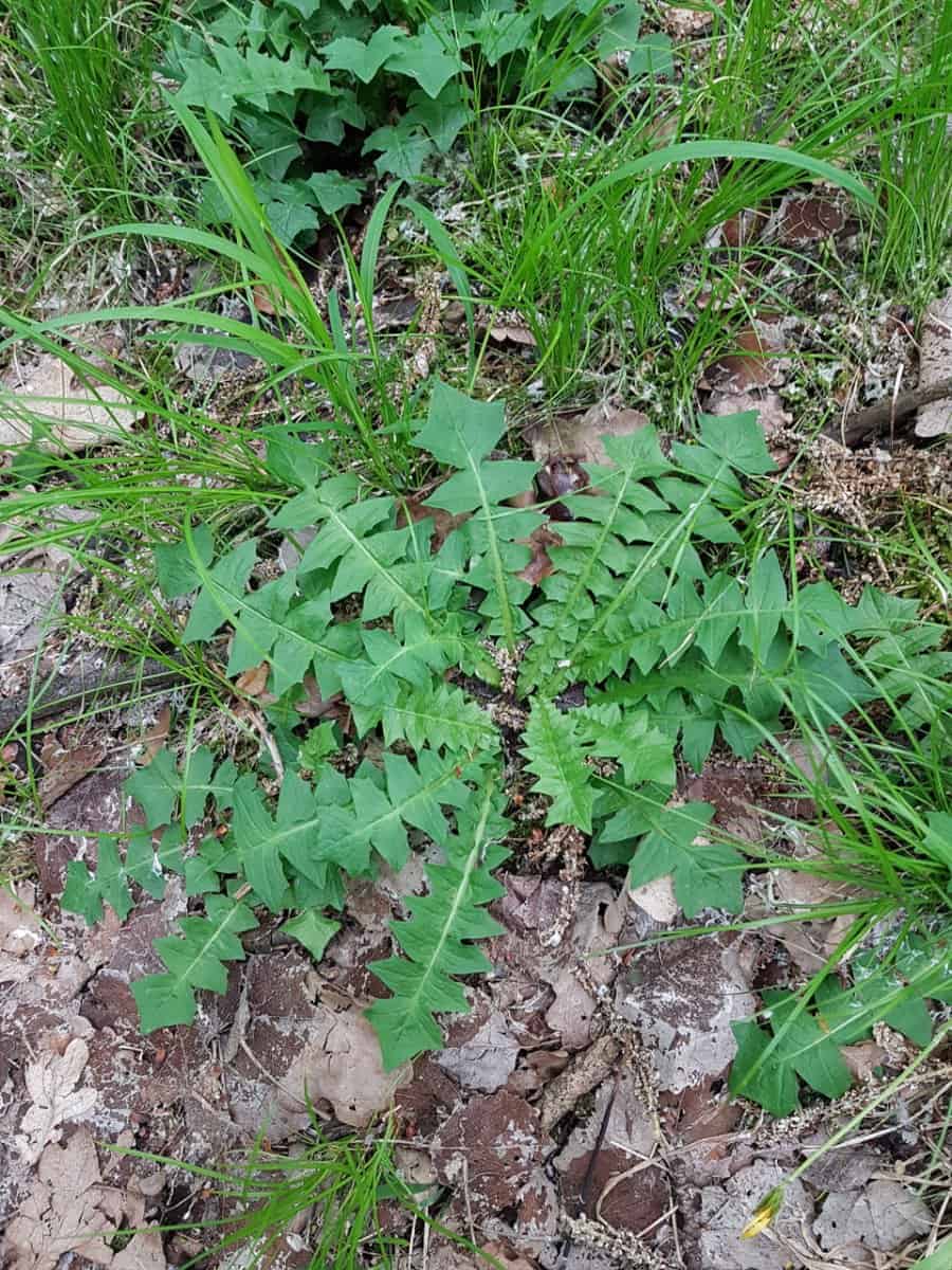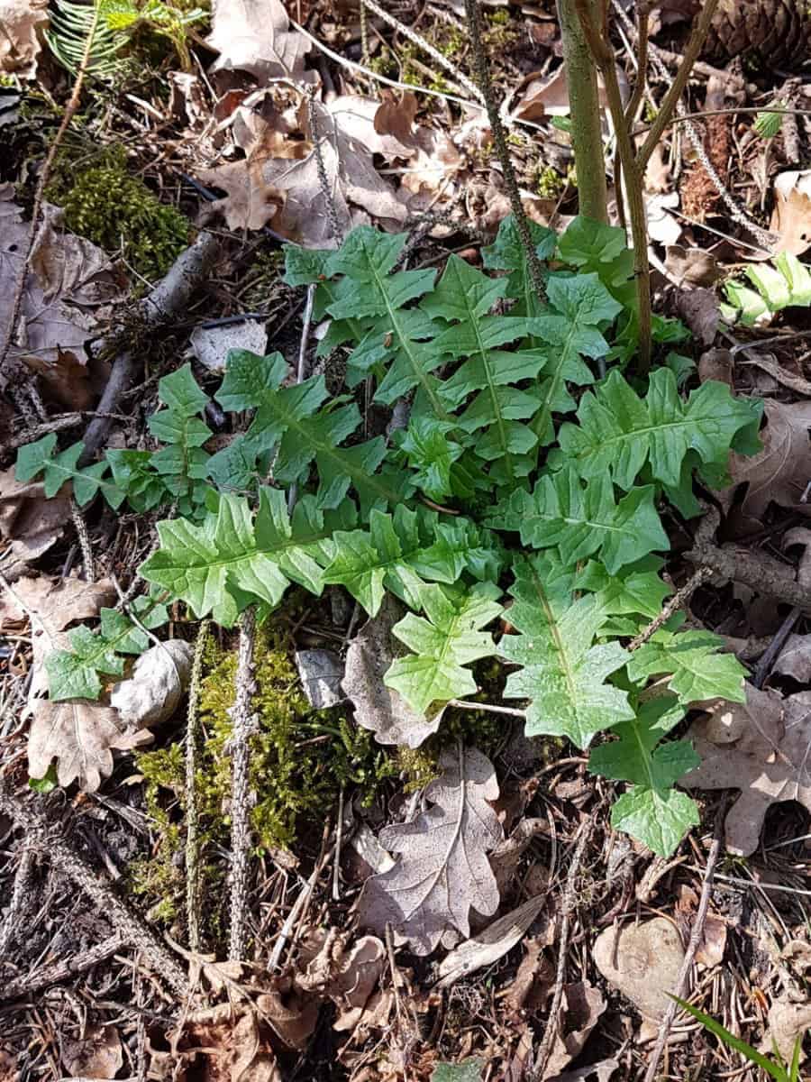 - Blätter (Rosette): Die grundständigen Blätter (etwa 10 cm lang) sind tief fiederteilig. Das entscheidende Erkennungsmerkmal: Die einzelnen Fiederabschnitte sind nicht wie beim Löwenzahn schrotsägeförmig nach unten gerichtet, sondern rauten- bis trapezförmig. Der Endlappen des Blattes ist dreieckig bis dreilappig.
