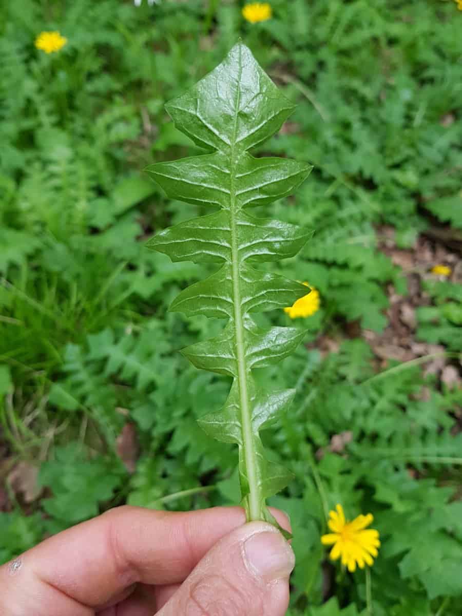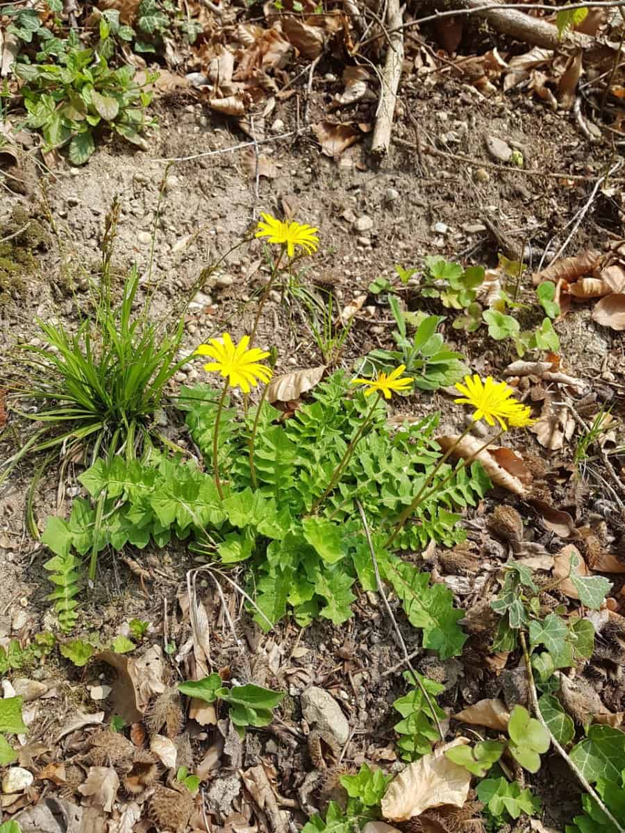 - Gewöhnlicher Löwenzahn (Taraxacum officinale): Besitzt einen Pusteblumen-Samenstand (Achänen mit Flugschirm), wächst meist im offenen Grünland (nicht im Bergwald) und hat Blätter mit spitzen, gezähnten, zum Blattgrund gerichteten Fiederabschnitten.