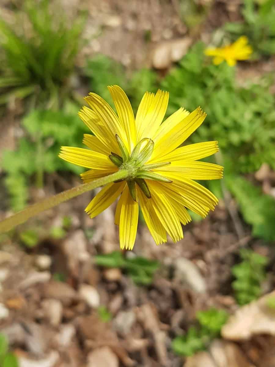 - Blütenkörbchen: An der Spitze der 10 bis 25 cm hohen Stängel steht jeweils nur ein einziges Blütenkörbchen (2,5 bis 4 cm Durchmesser). Es besteht ausschließlich aus gelben Zungenblüten, die am oberen Rand fünf kleine Zipfel (Kronzipfel) aufweisen.