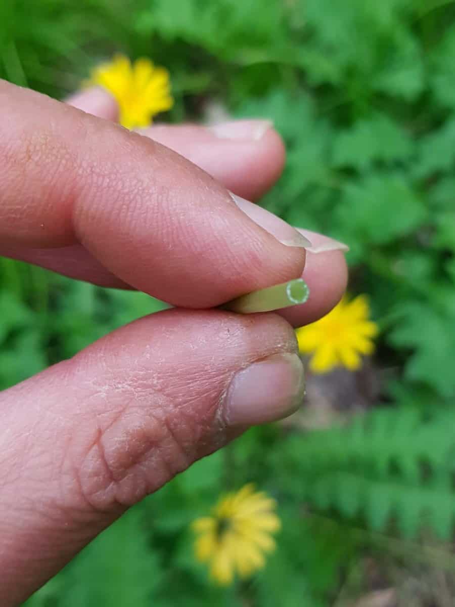 - Stängel: Der aufrechte Blütenstängel ist blattlos (ohne Stängelblätter), hohl und sondert bei Bruch ebenfalls Milchsaft ab.