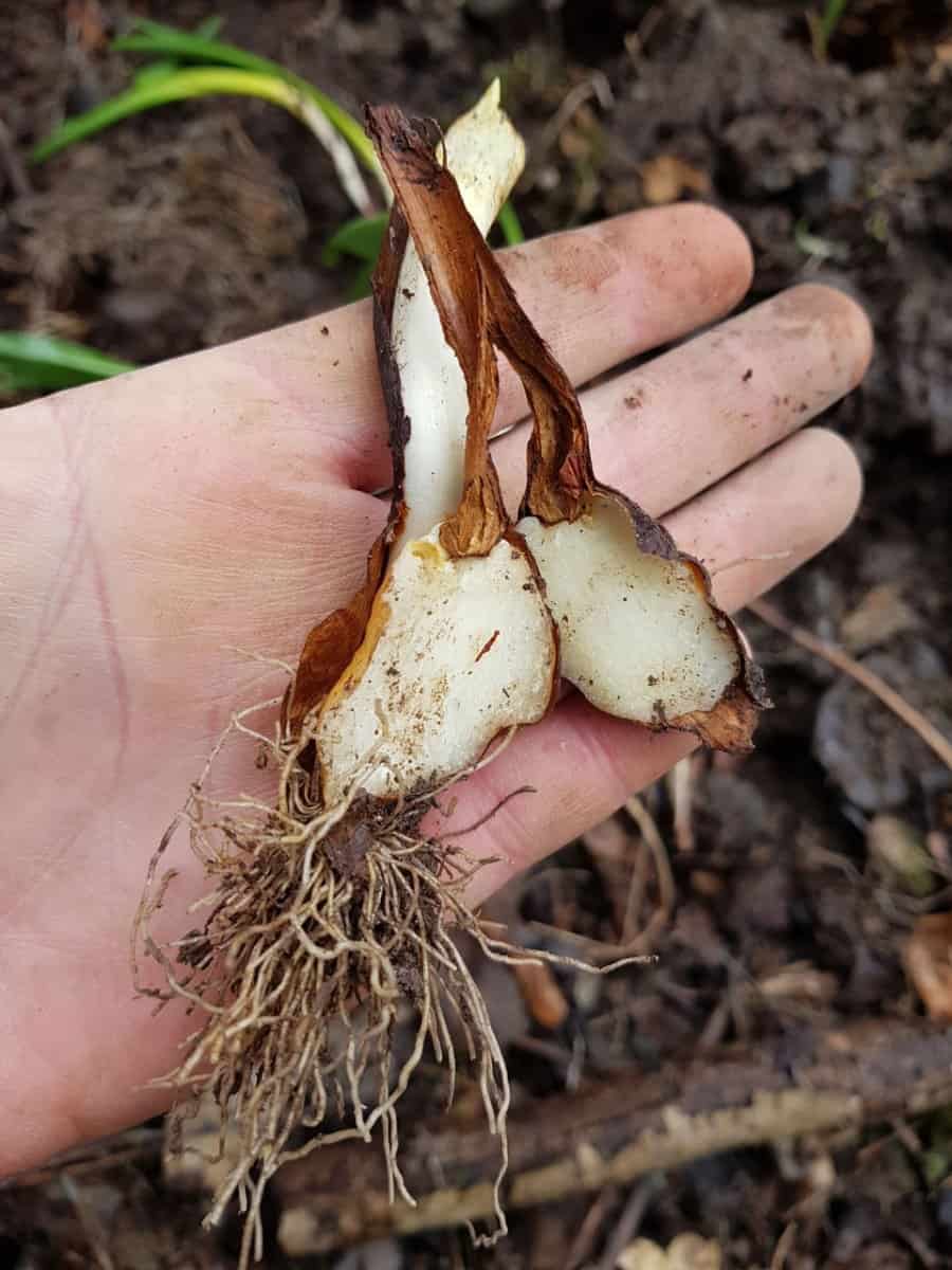 - Knolle: Die Pflanze überdauert als braunhäutige Sprossknolle (2,5 bis 5 cm dick) tief im Erdboden.