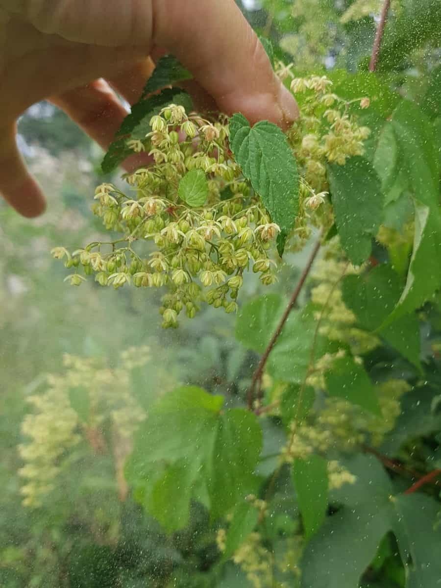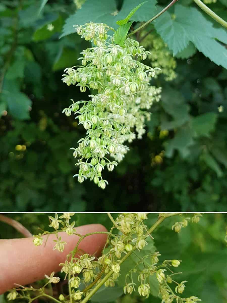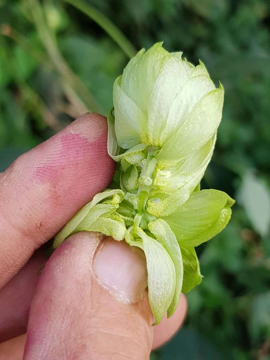 - Blüte: Zweihäusig getrenntgeschlechtig (diözisch). Männliche Blüten sind grün und stehen in lockeren Rispen. Weibliche Blüten bilden zapfenförmige, ährige Blütenstände, deren Hochblätter sich nach der Blüte vergrößern (Hopfendolden).