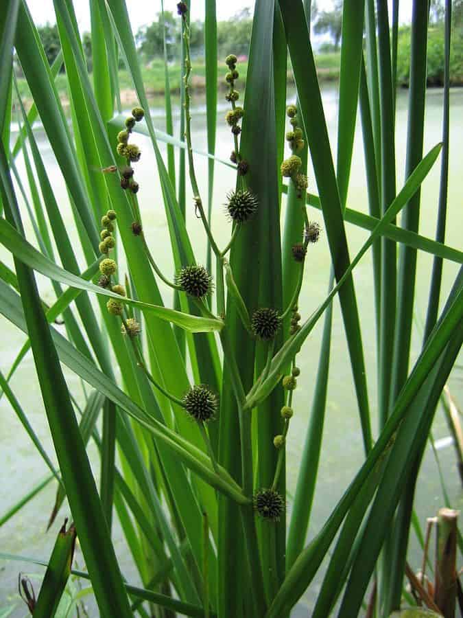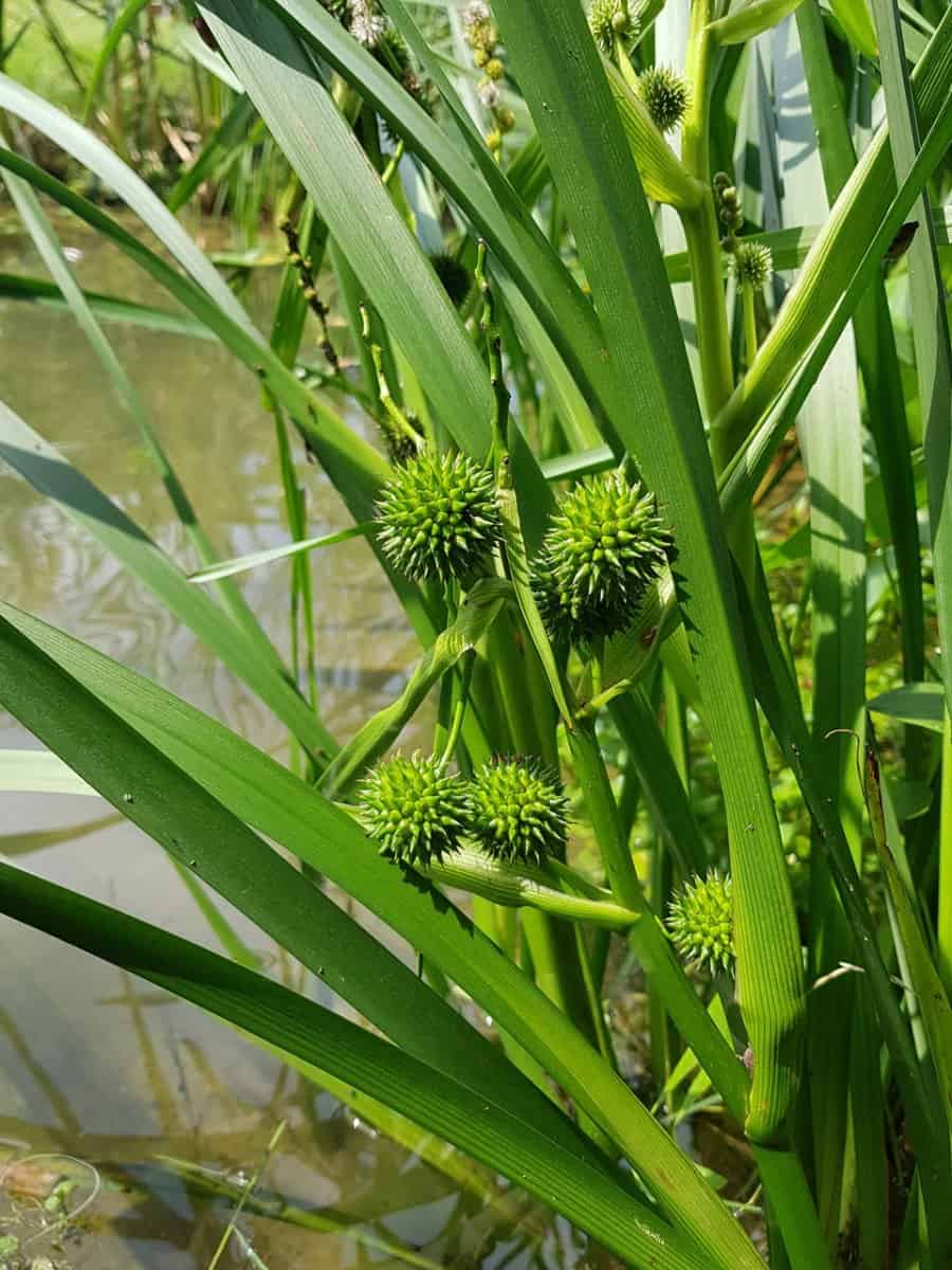Der Ästige Igelkolben fällt durch seinen sparrig verzweigten Blütenstand und die starr aufrechten, schwertartigen Blätter im Flachwasserbereich auf.