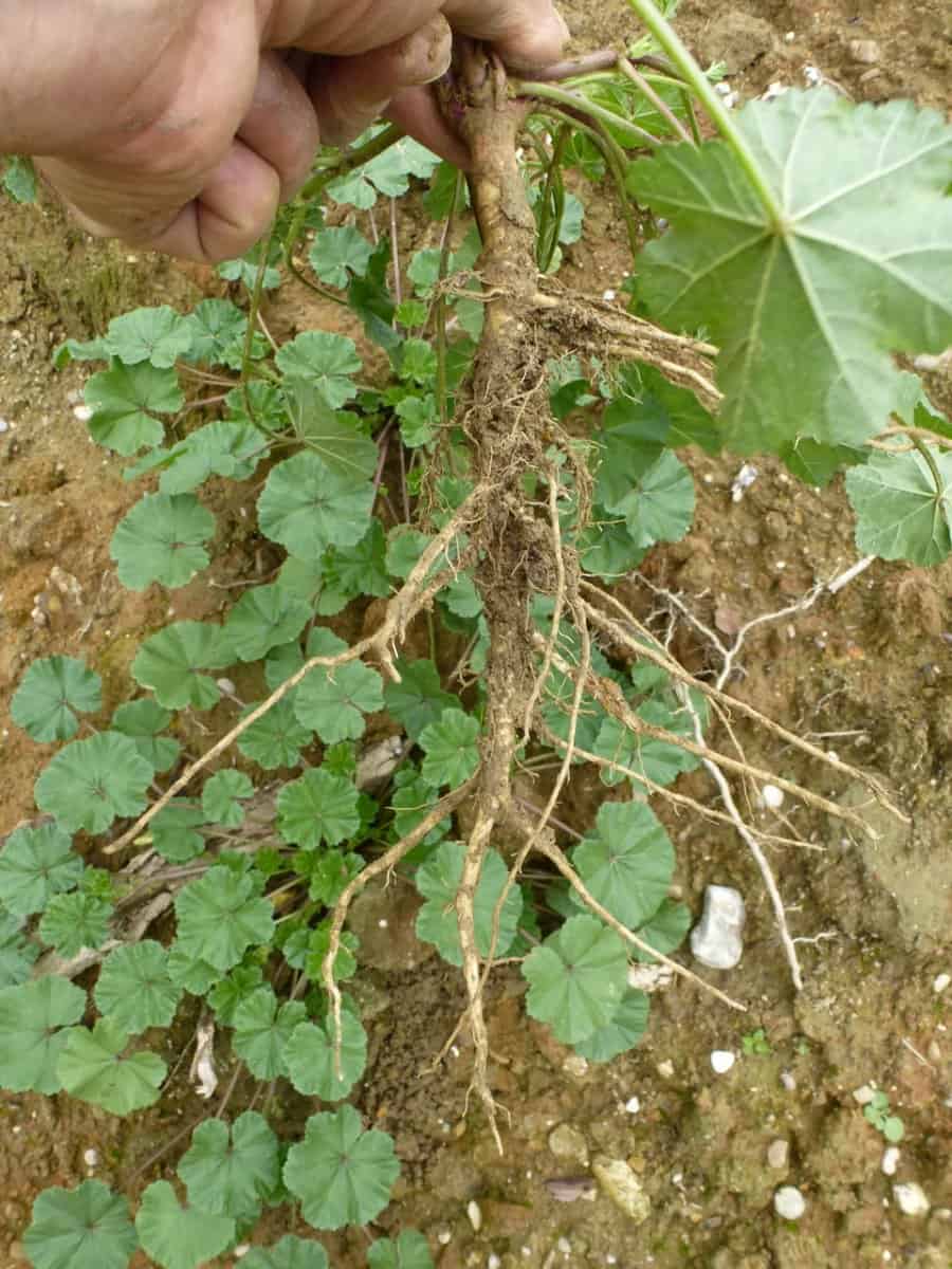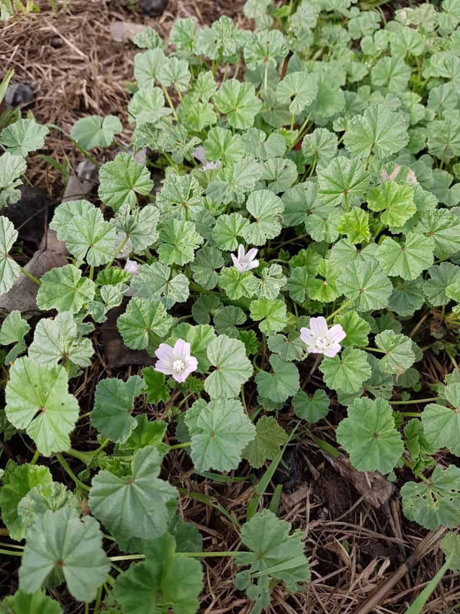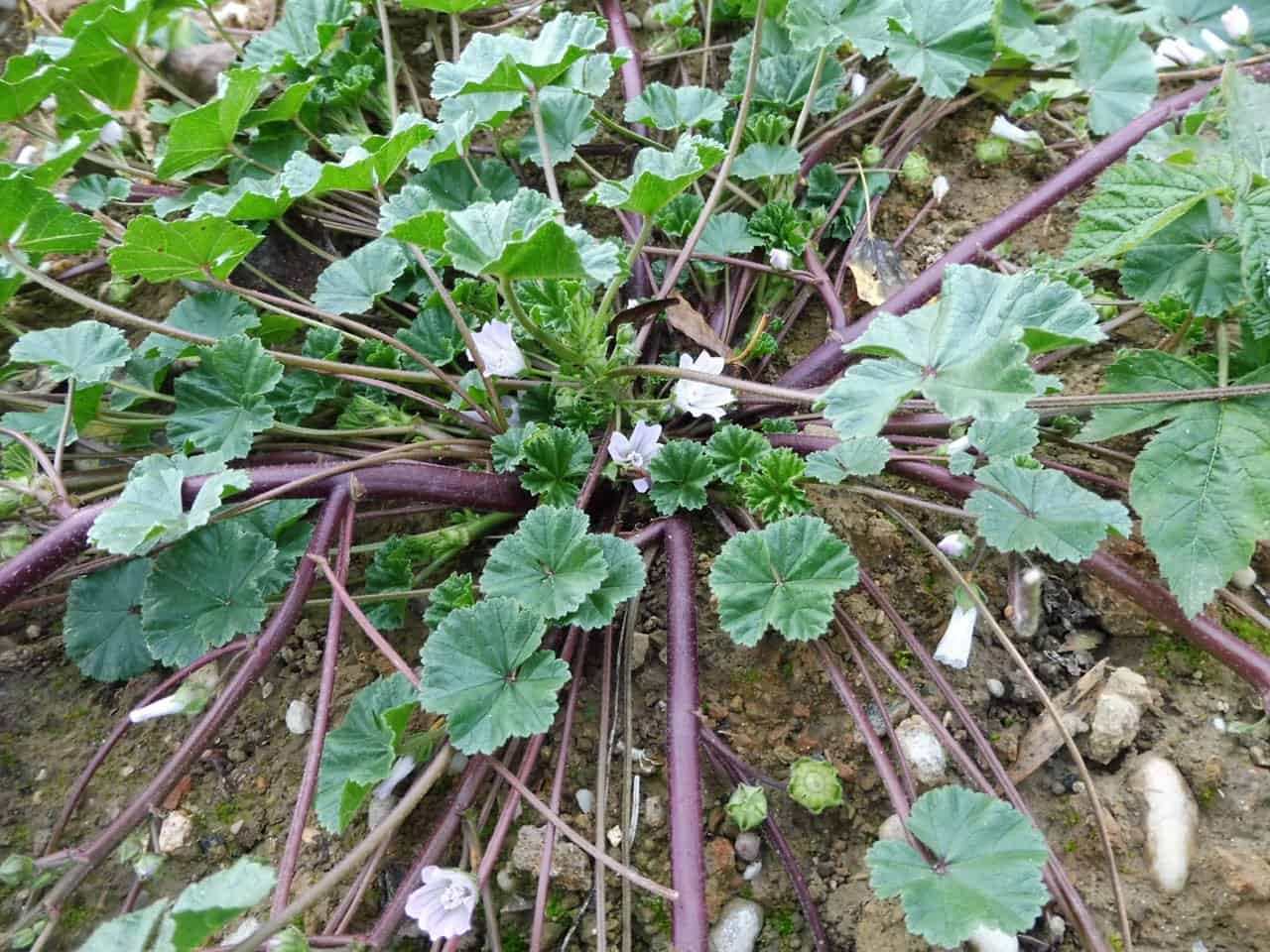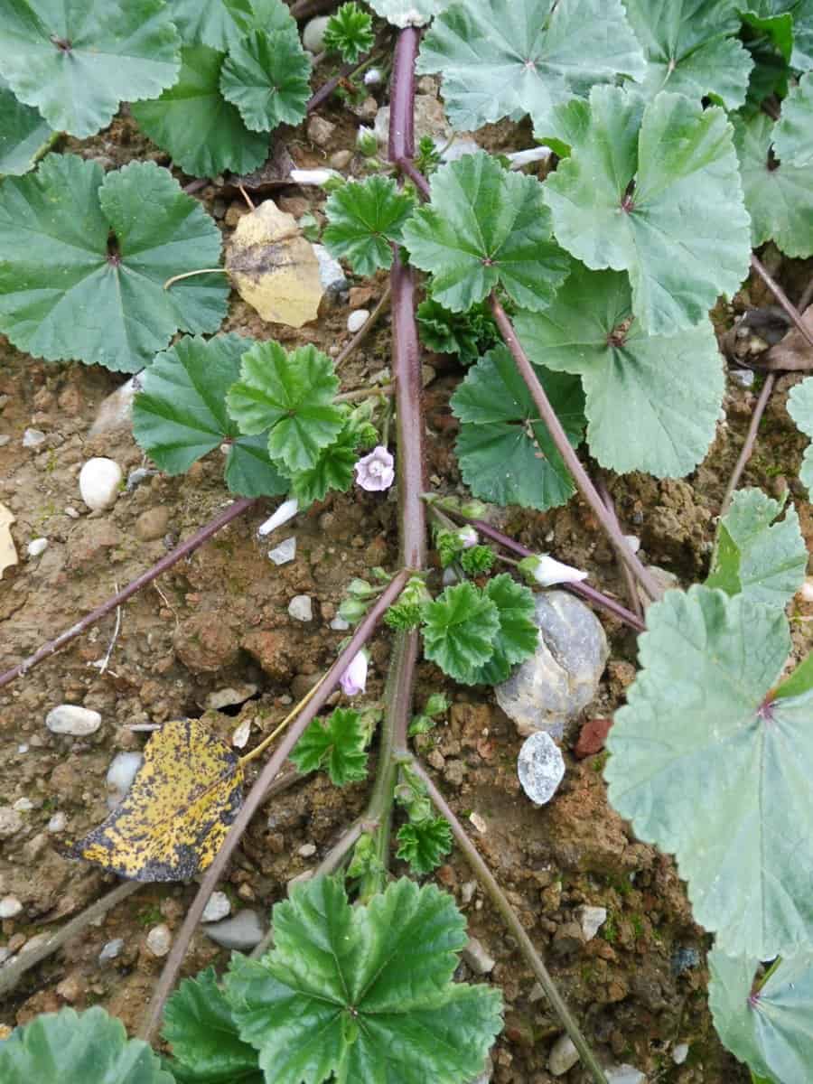Die Weg-Malve wächst im Gegensatz zu vielen ihrer Verwandten selten steil aufrecht, sondern bildet meist ein dichtes, kriechendes Geflecht aus Trieben am Boden. Sie ist an ihren fast runden Blättern und den sehr kleinen, blassen Blüten zu erkennen.