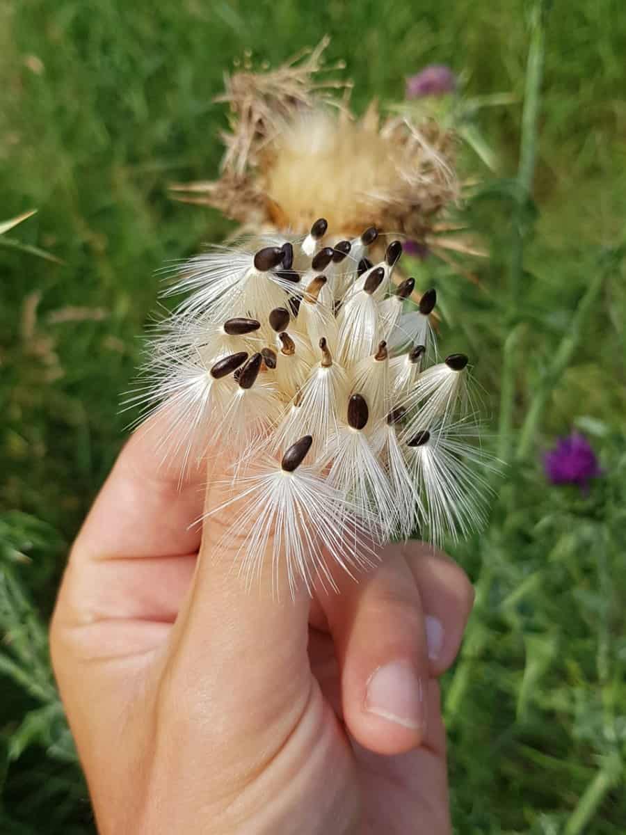 - Früchte: Aus den Blüten entwickeln sich glänzend schwarze, oft grau gefleckte Schließfrüchte (Achänen). Sie tragen an der Spitze einen 15 bis 20 mm langen, seidig-weißen Haarkranz (Pappus), der der Windausbreitung dient.