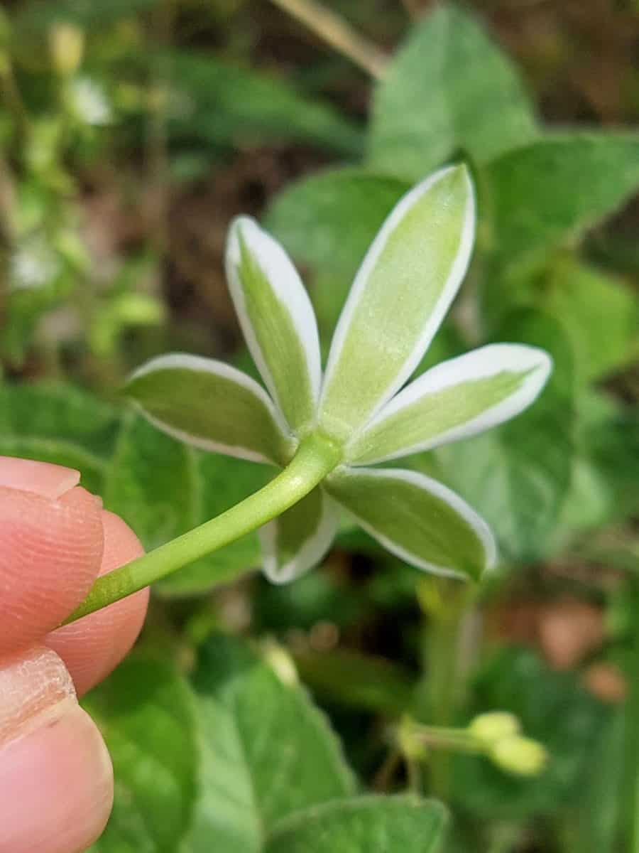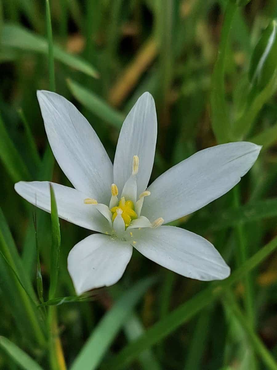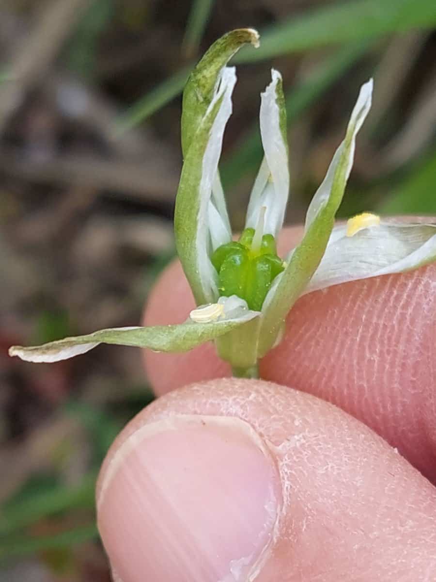 - Blüte: Am Ende eines blattlosen Stängels stehen fünf bis zwölf Blüten in einer kurzen Schirmtraube. Die Blüten sind dreizählig und sternförmig. Die sechs weißen Blütenhüllblätter (Tepalen) werden 15 bis 22 mm lang und weisen auf der Unter- bzw. Außenseite einen markanten grünen Mittelstreifen auf. Der mittige Fruchtknoten besitzt eine gelbe Spitze.