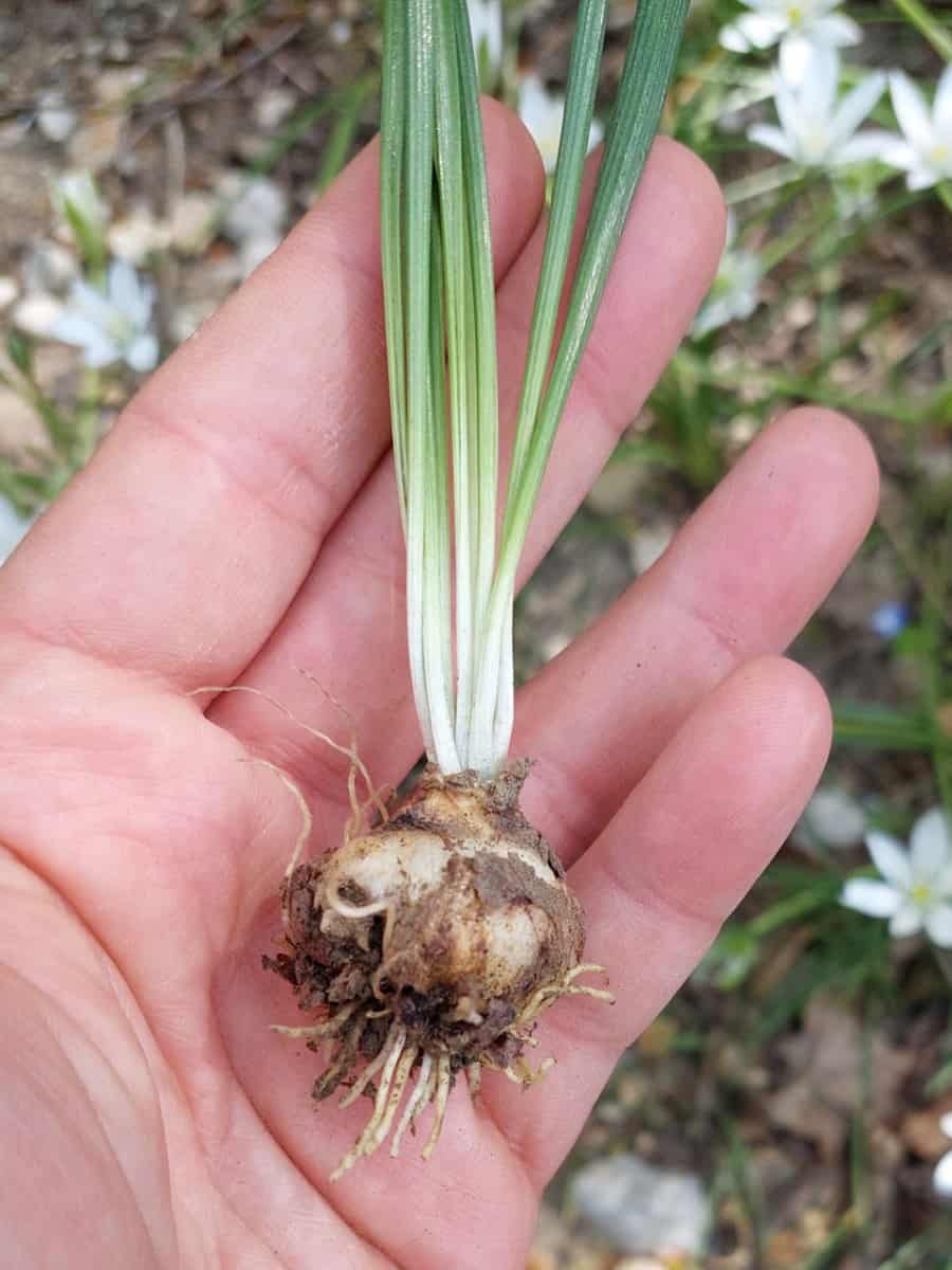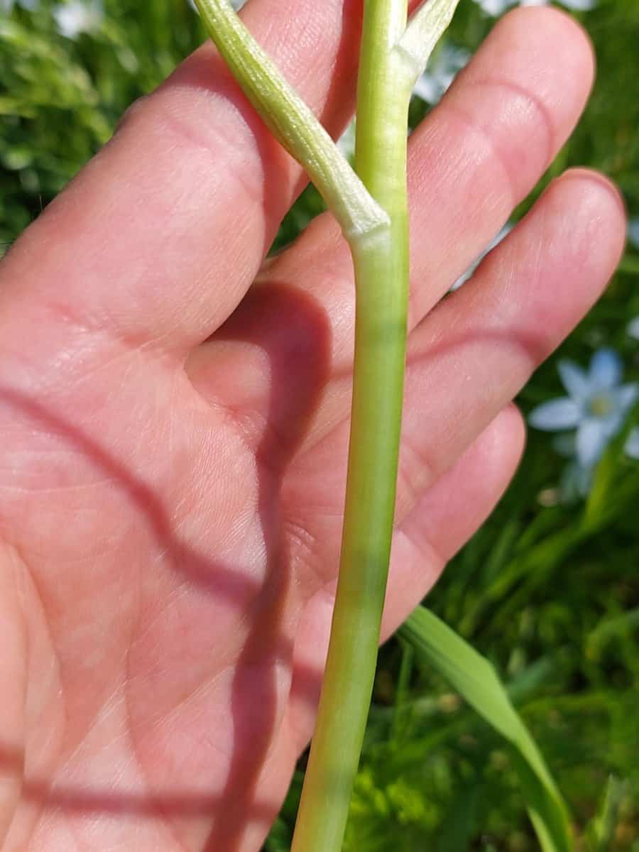- Wurzelwerk: Unterirdische Zwiebel (in 2 bis 4 cm Tiefe) mit Brutzwiebeln