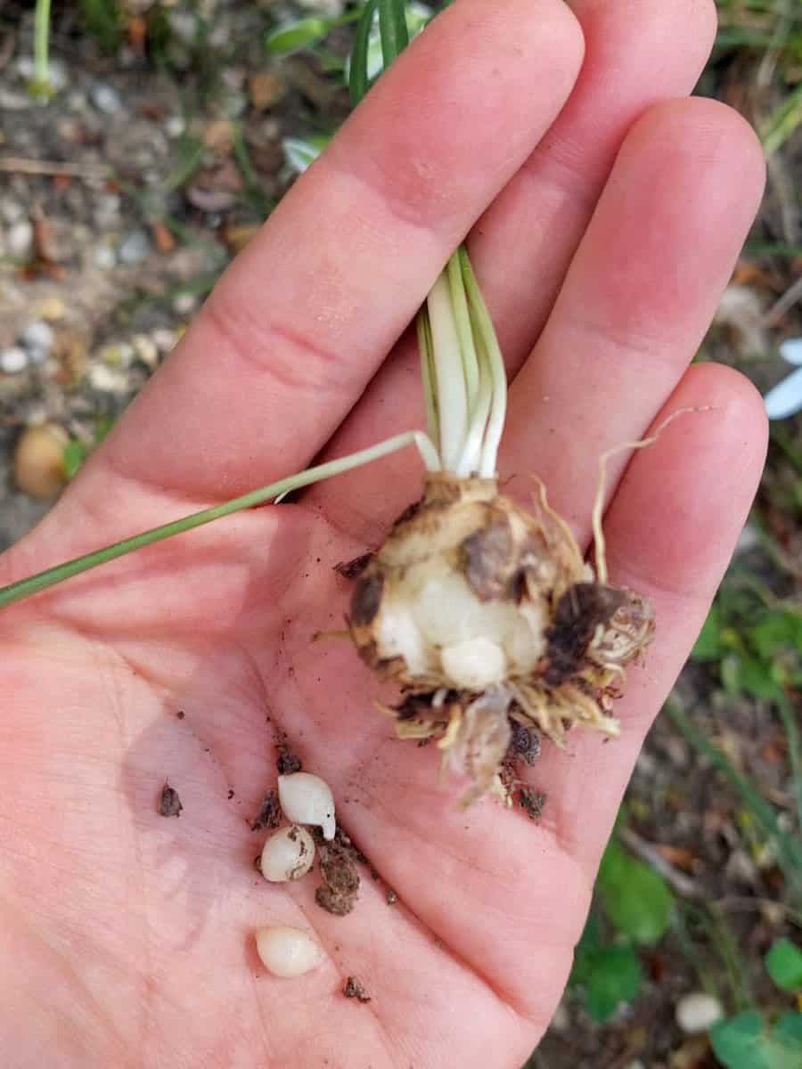 - Überdauerungsorgan: Die Überwinterung erfolgt durch eine Zwiebel. Diese ist von vier bis fünf spitzen Brutzwiebeln umgeben, die bereits im ersten Jahr austreiben. Die vorjährigen Zwiebelblätter sind miteinander verwachsen.