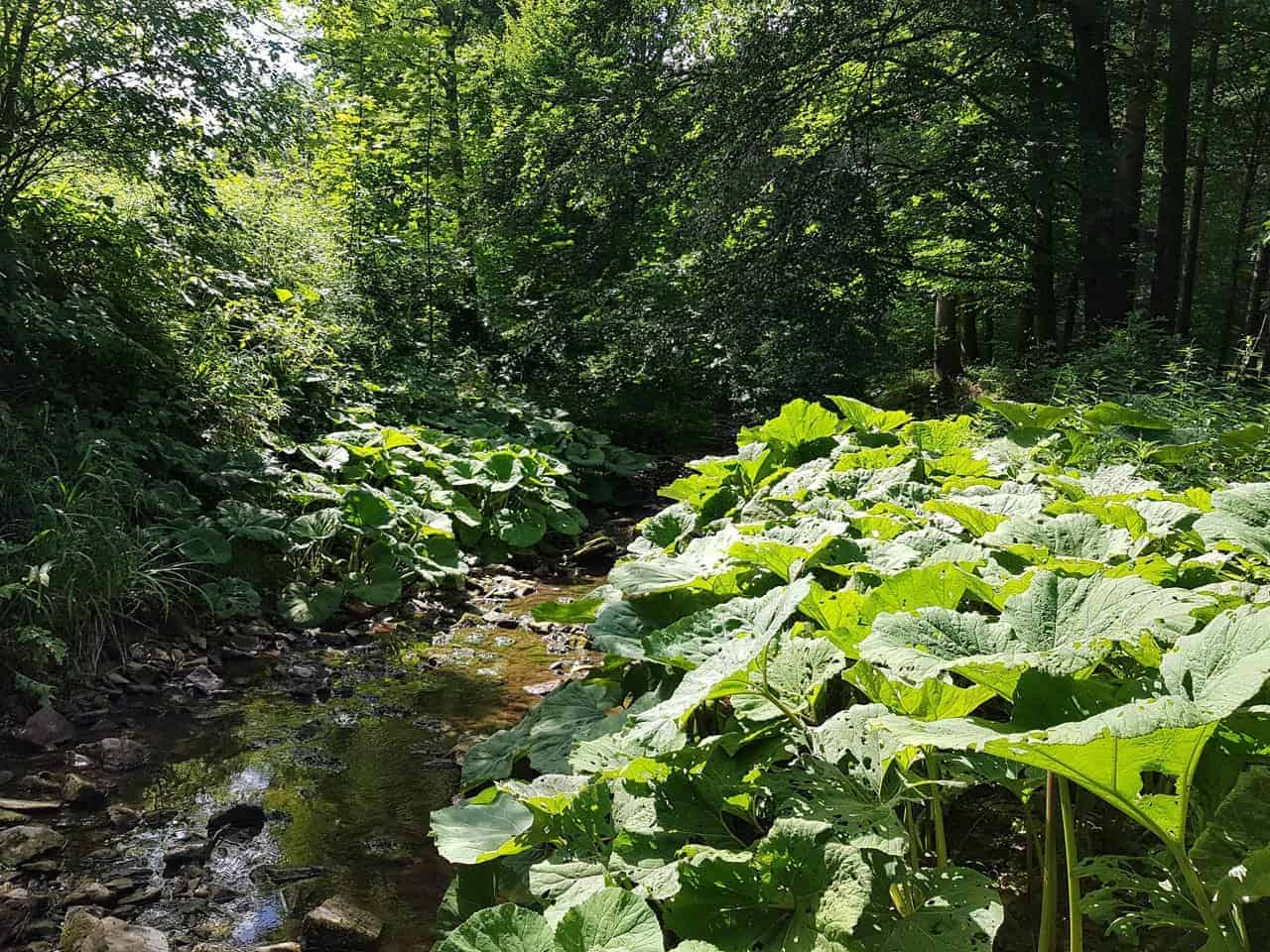 Die Gewöhnliche Pestwurz dominiert feuchte Uferzonen oft flächendeckend. Einzigartig ist ihre Phänologie: Sie blüht im zeitigen Frühjahr völlig blattlos. Erst wenn die Blütenstände verblühen, schießen die riesigen Grundblätter aus dem Boden.