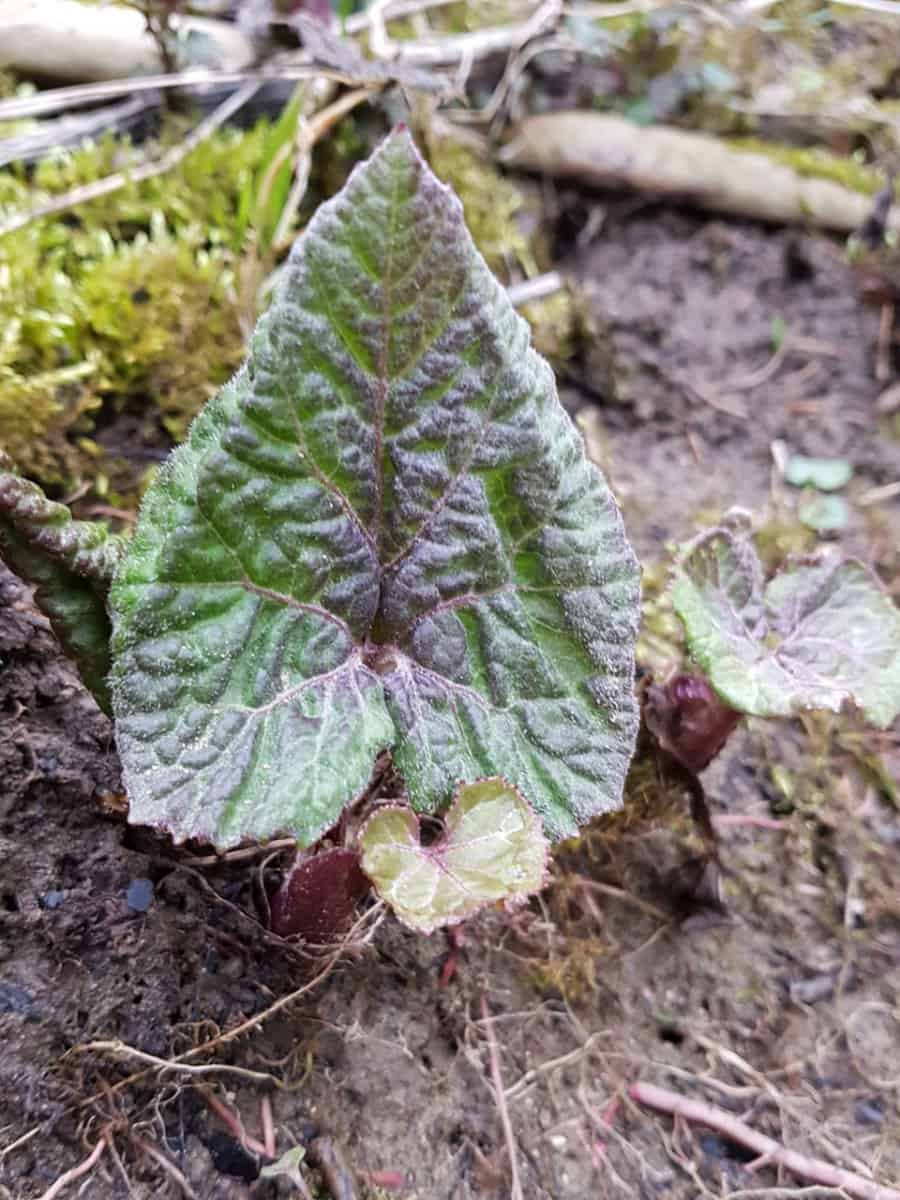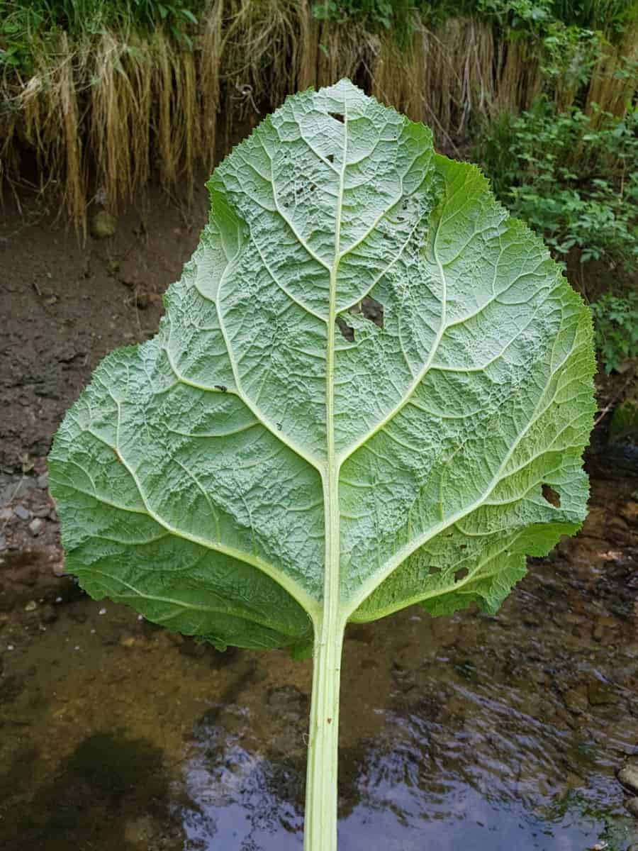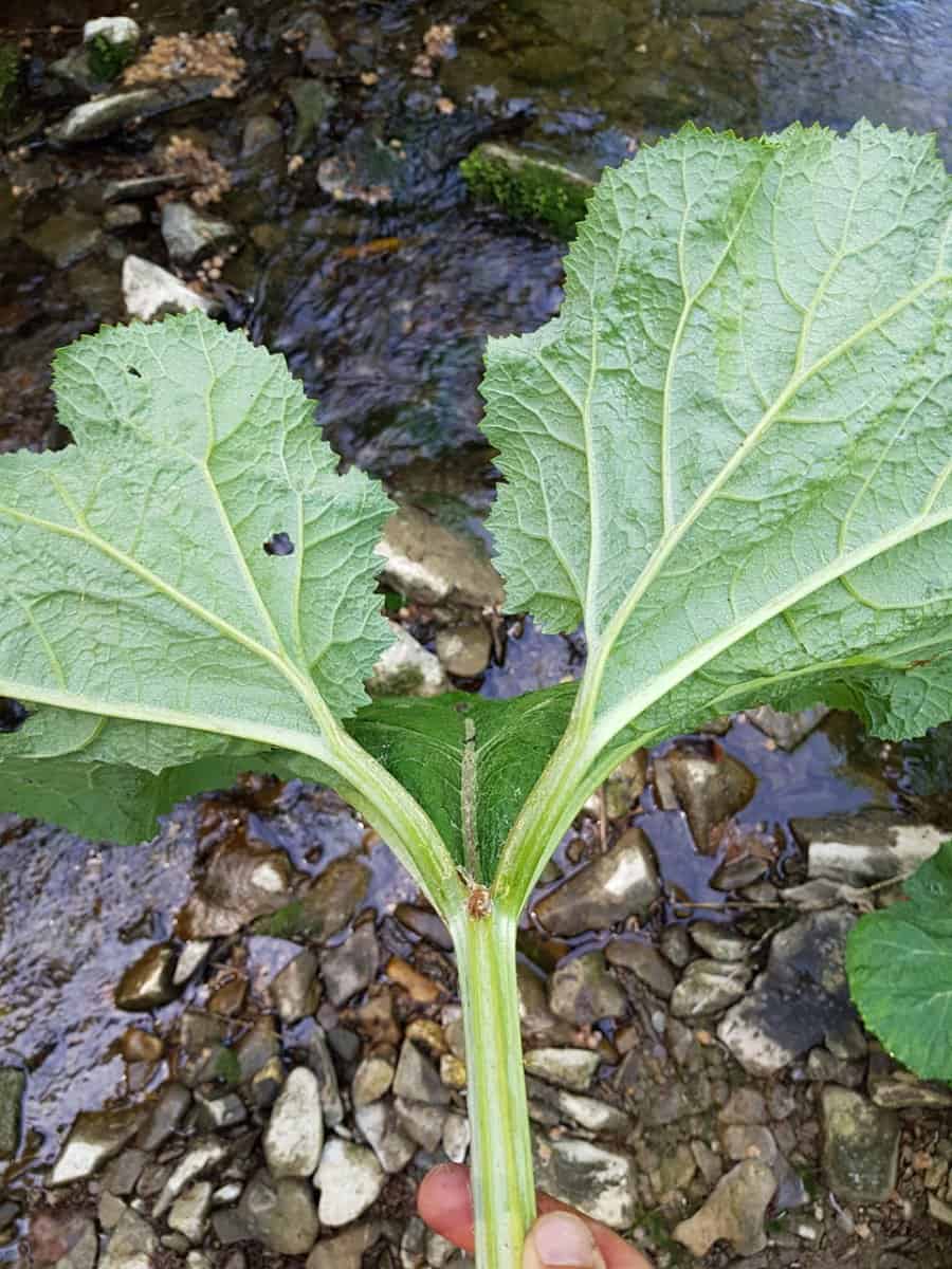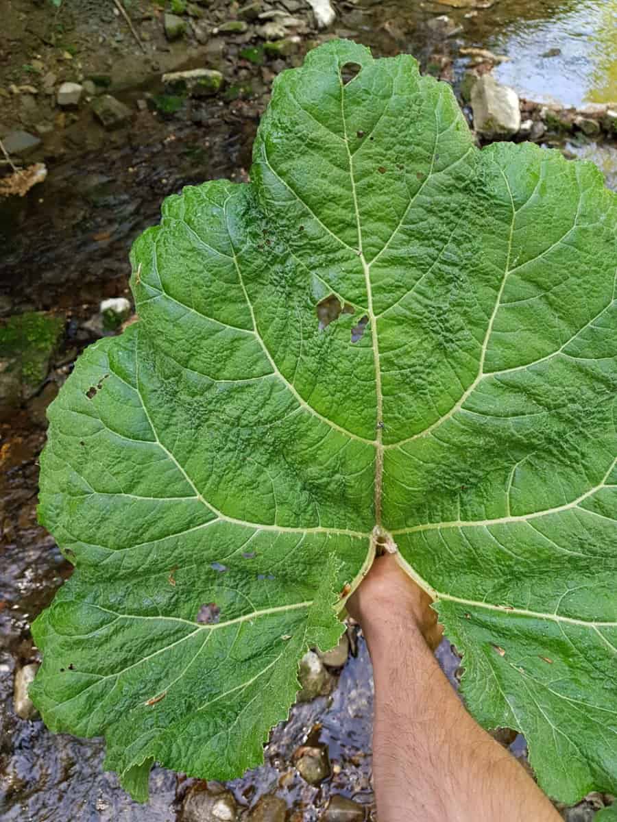 - Blätter: Sie erscheinen erst nach der Blüte. Es handelt sich um gewaltige, grundständige Blätter, die rhabarberähnliche Ausmaße (bis zu 90 cm Breite) erreichen. Die Form ist rundlich bis nierenförmig, der Blattrand ist relativ stumpf und unregelmäßig gezähnt (nicht spitz).