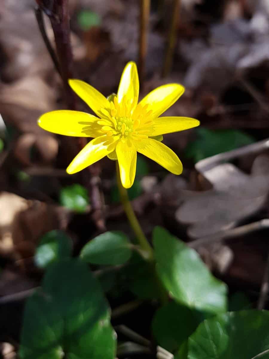 Das Scharbockskraut erkennst du im zeitigen Frühjahr an seinen dichten, sattgrünen Blattteppichen, aus denen leuchtend goldgelbe, sternförmige Blüten ragen, die stark an kleine Sonnen erinnern.