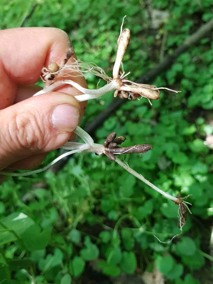 - Wurzelwerk: dicht unter der Oberfläche liegendes Rhizom mit feigwarzenähnlichen Wurzelknollen