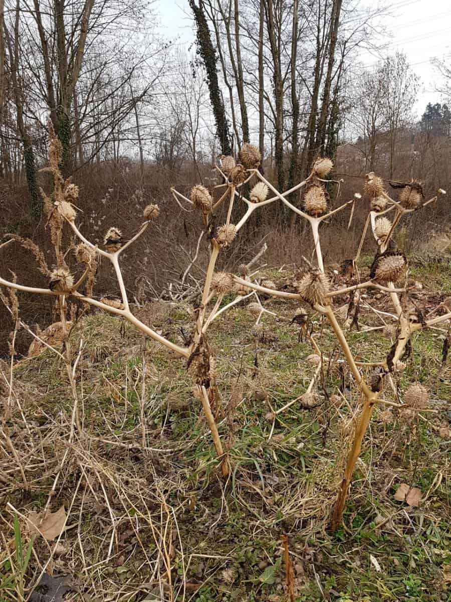 - Früchte & Samen: Die aufrecht stehenden, eiförmigen Kapselfrüchte (2 bis 4 cm lang) sind dicht mit harten Stacheln besetzt. Zur Reife öffnet sich die braune Kapsel an der Spitze vierklappig und gibt 300 bis 500 nierenförmige, mattschwarze Samen frei.