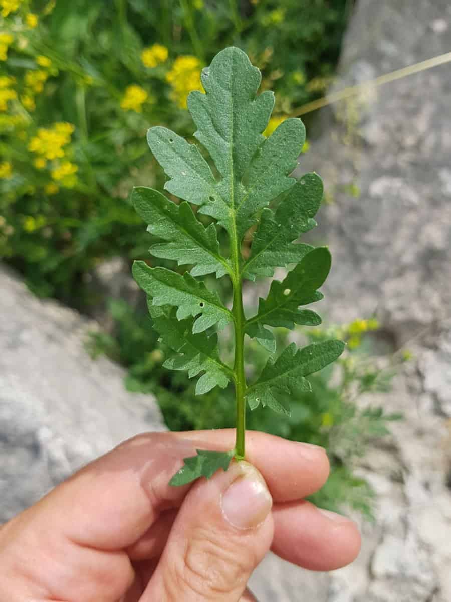 - Blätter: Die unteren Laubblätter sind tief gefiedert bis fiederteilig, mit vier bis sieben Paaren gezähnter Abschnitte auf jeder Seite. Die weiter oben liegenden Blätter sitzen oft direkt am Stängel (ungestielt) und sind schmaler sowie weniger stark geteilt. Wichtig: Die Blätter umfassen den Stängel nicht.