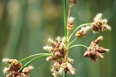 Blüte: Die Blütenstände der Gewöhnlichen Teichbinse entwickeln sich etwas unterhalb der Stängelspitze. Sie bestehen aus zahlreichen Ährchen und bilden eine sogenannte Spirre. Die unscheinbar kleinen Blüten bestehen aus borstigen Blütenhüllblättern, drei Staubblättern und einem Fruchtknoten mit langem Griffel und einer fädigen Narbe.