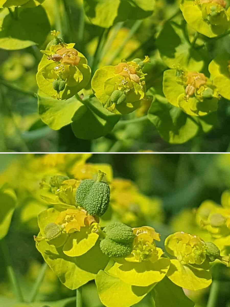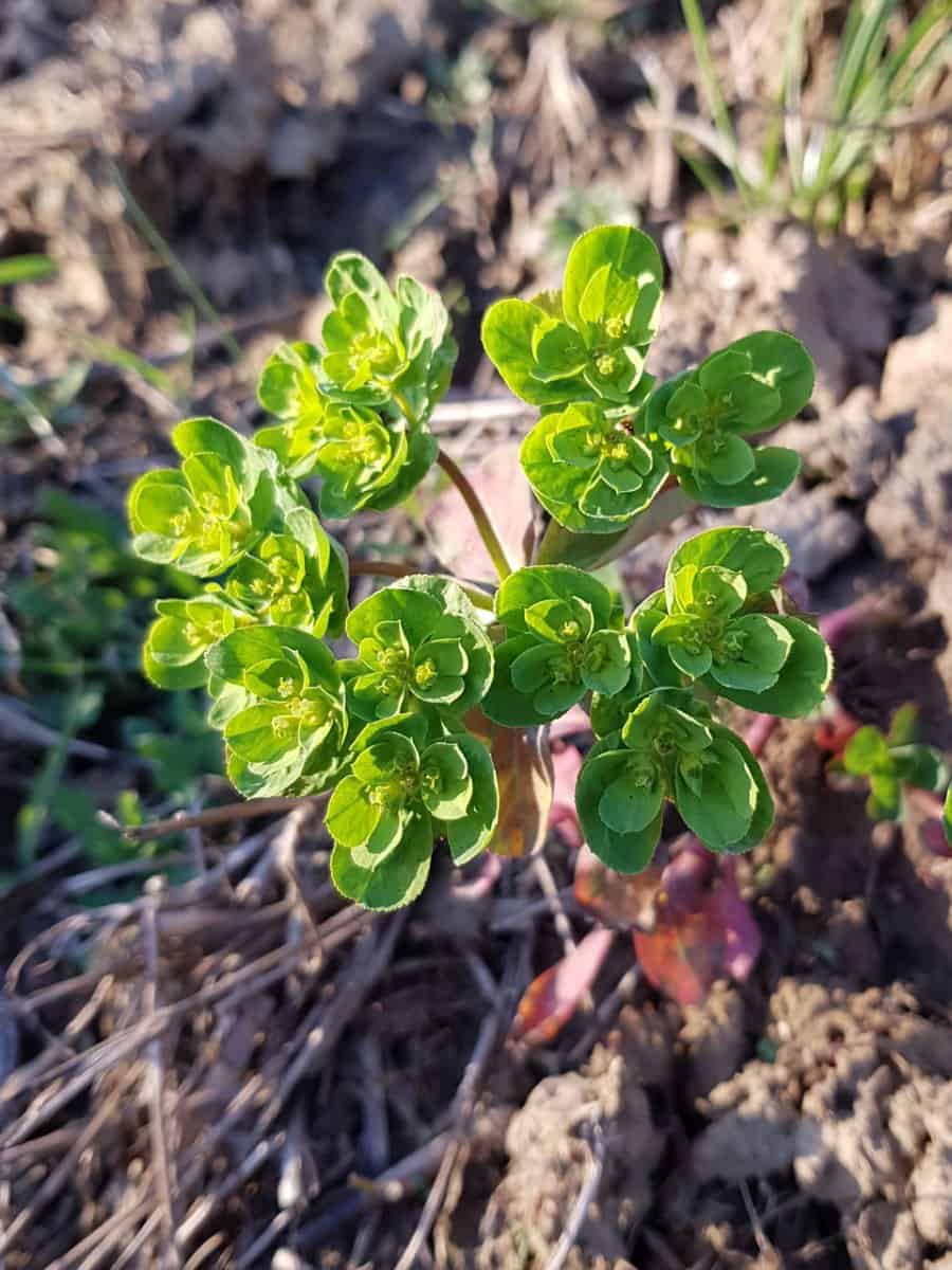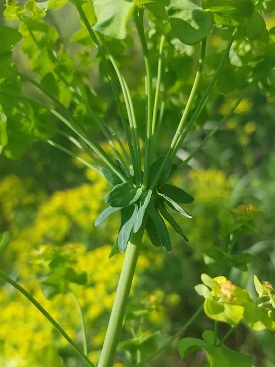 - Sonnenwend-Wolfsmilch (Euphorbia helioscopia): Hat viel breitere, spatelförmige, oft fein gezähnte Blätter und einen deutlich gelb-grüneren, stark flächigen Blütenstand.